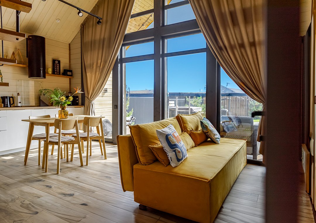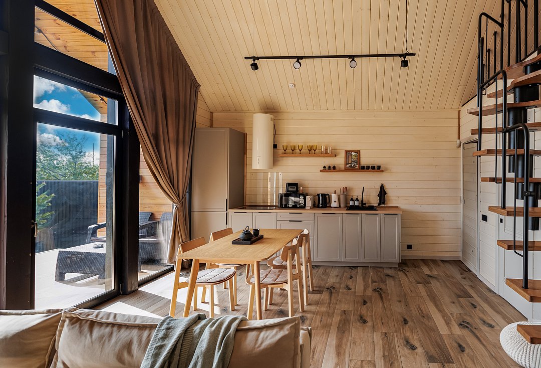 Внутри дома оборудован теплый пол в гостиной зоне. Есть вся необходимая кухонная утварь, посудомоечная машина, капсульная кофеварка, тостер, микроволновая печь, постельное белье и полотенца. К услугам гостей телевизор с функцией Smart TV, высокоскоростной Wi-Fi, две двуспальные кровати, раскладной диван, а также современный санузел, оснащенный душевой кабиной и теплым полом.