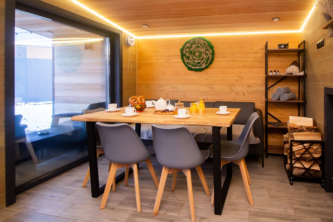 На базе отдыха четыре отдельных дома с панорамными окнами и живописным видом на горнолыжные склоны. Каждый дом рассчитан на комфортное размещение до шести человек. На территории имеется индивидуальная беседка с зоной для барбекю, включая шампуры, и купель-чан возле каждого домика (услуга предоставляется за дополнительную плату). Для удобства в домах предусмотрены халаты и тапочки для использования в чане.
