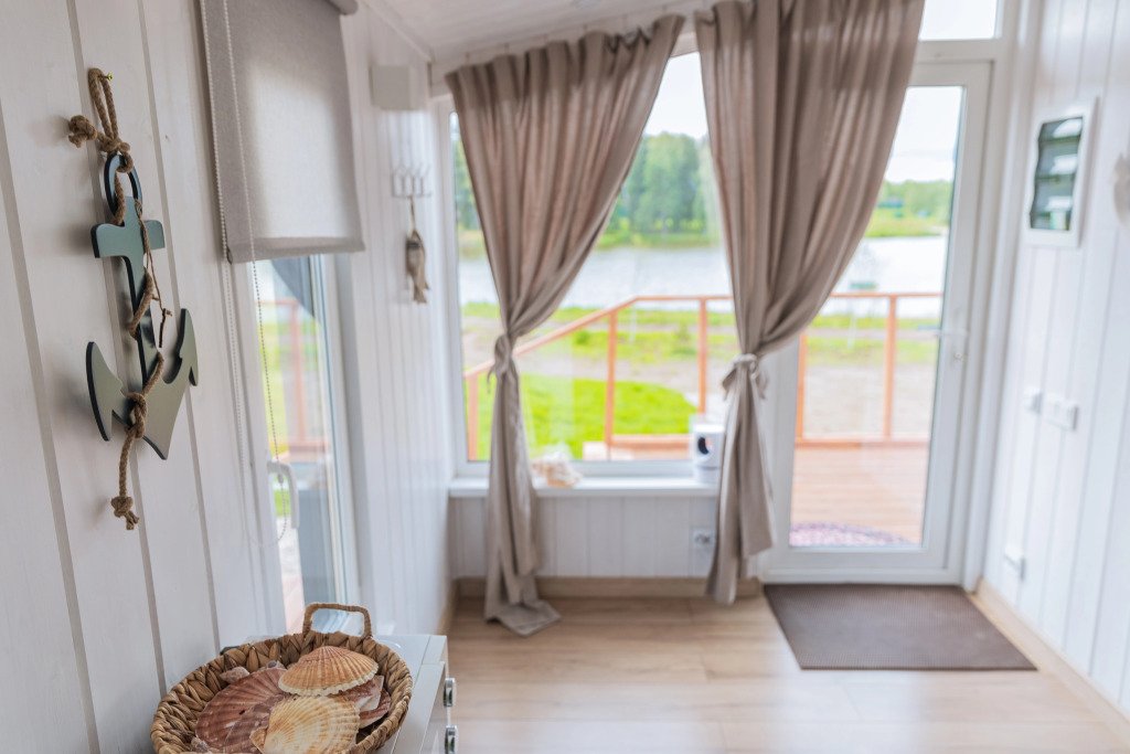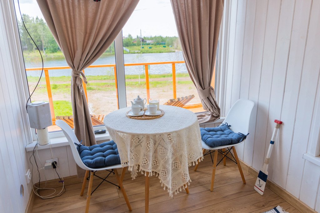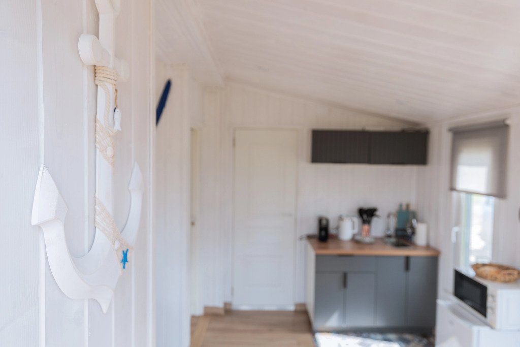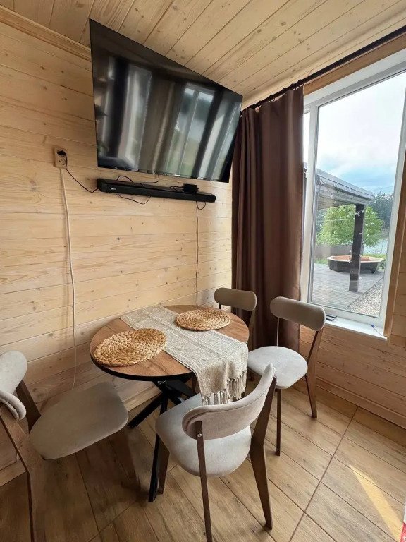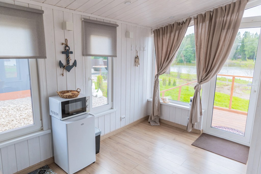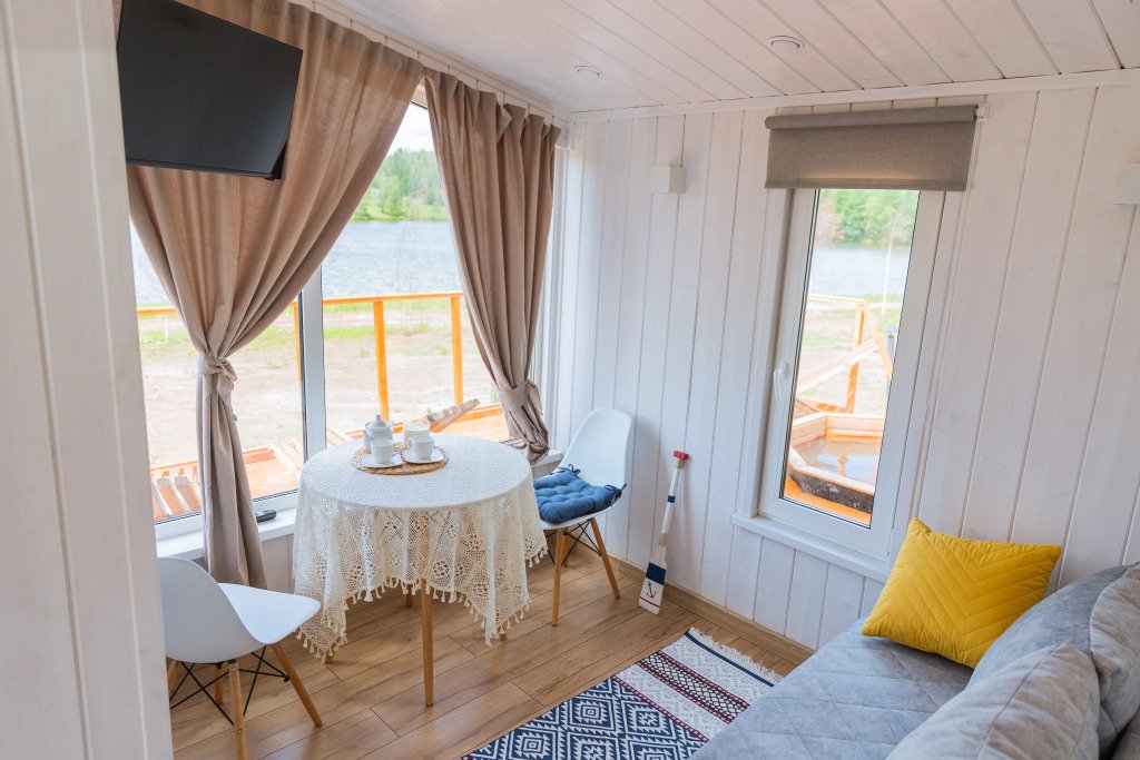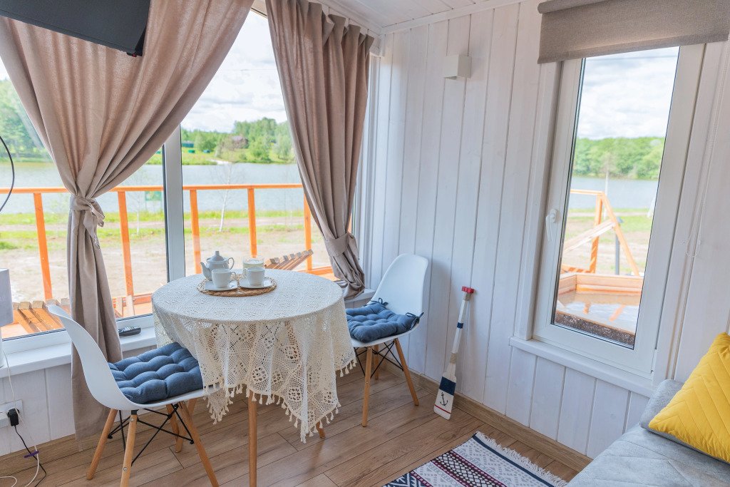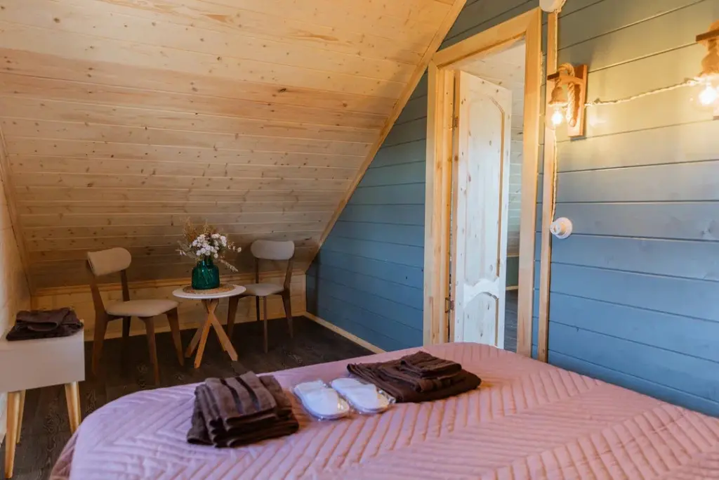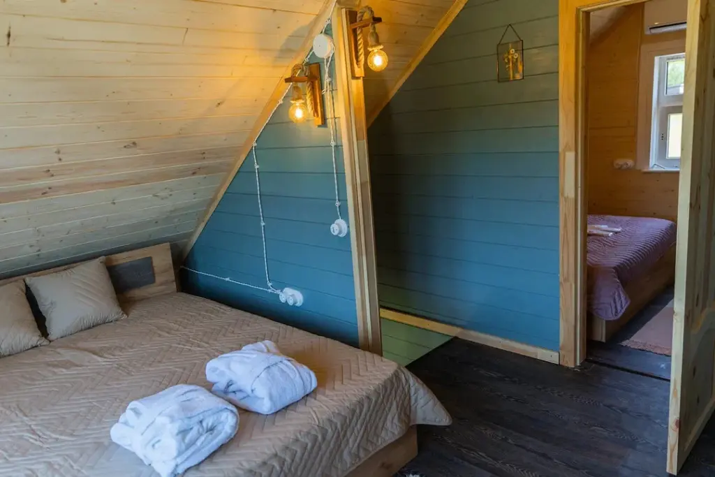 Глэмпинг представляет собой деревянные дома, рассчитанные на двоих или компанию до 6 человек. В каждом доме есть спальни, гостиная с диваном и обеденной зоной, полностью оборудованная кухня с плитой, холодильником, чайником, капсульной кофемашиной, телевизор. В распоряжении гостей полотенца, халаты, тапочки.