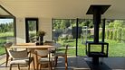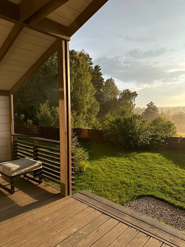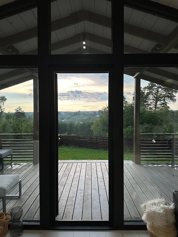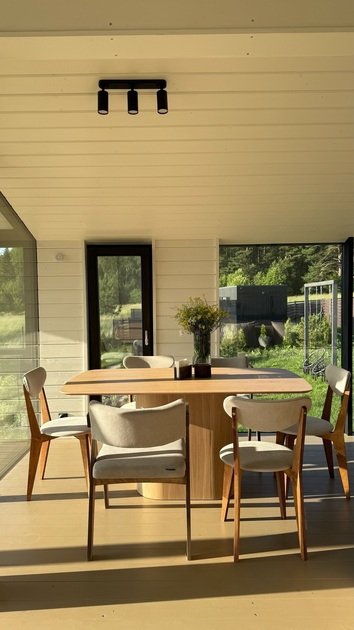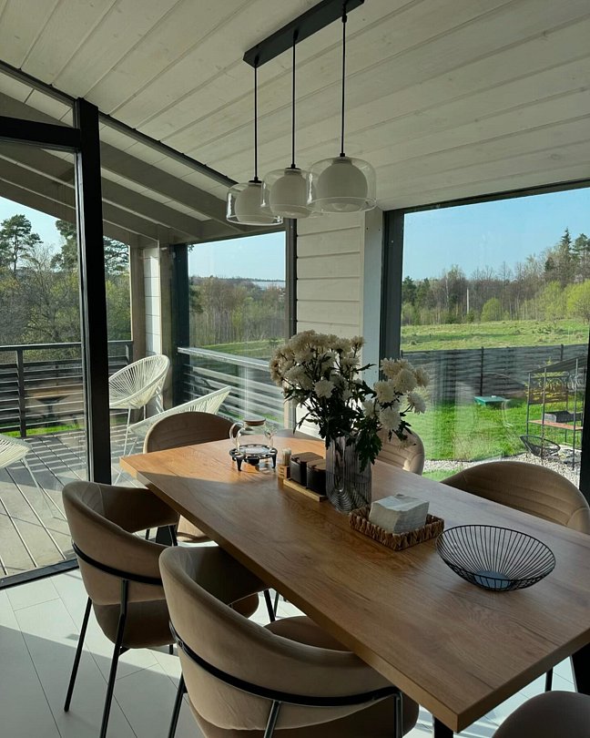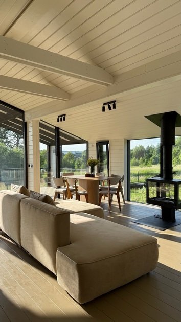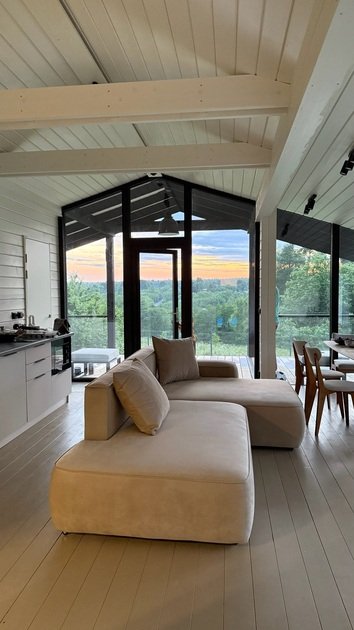 В этом доме легко замедлиться и насладиться осенним спокойствием. Просторные комнаты наполнены светом и теплом благодаря большим окнам, натуральным материалам и тщательно продуманным деталям.