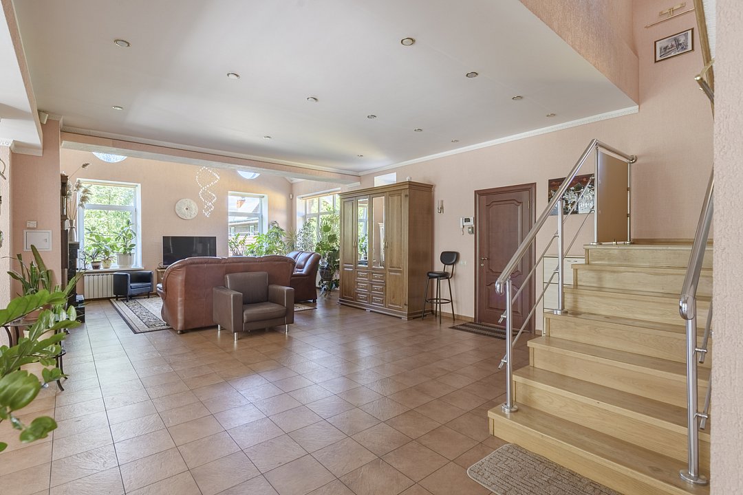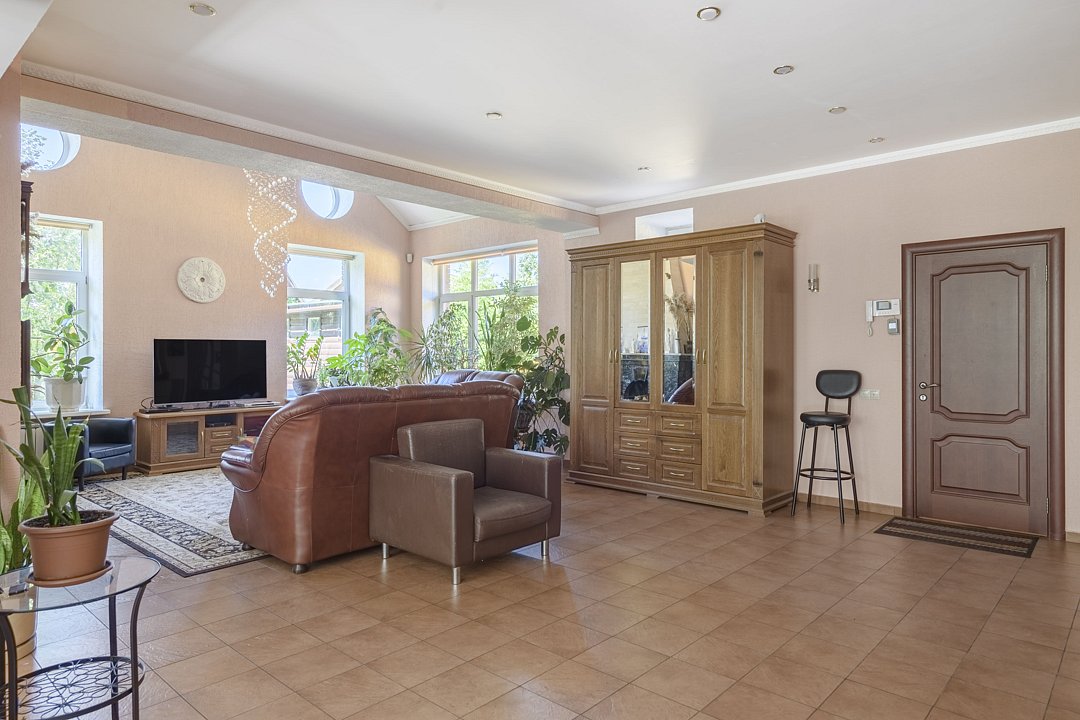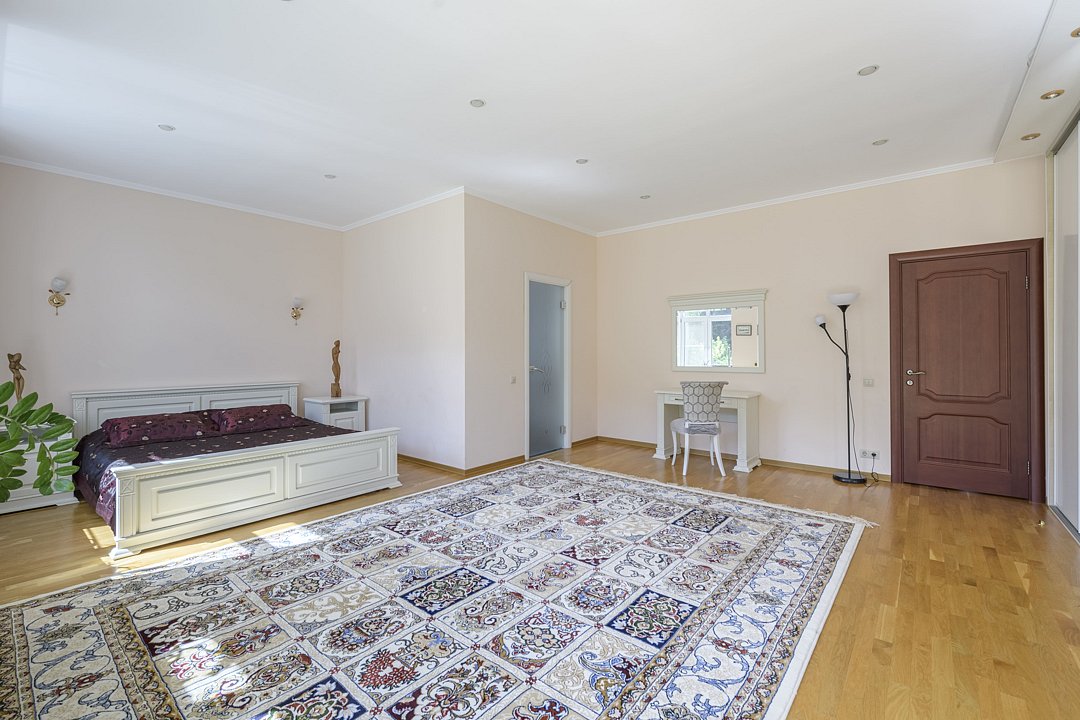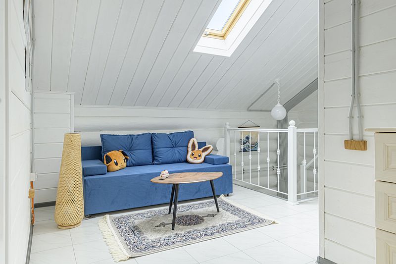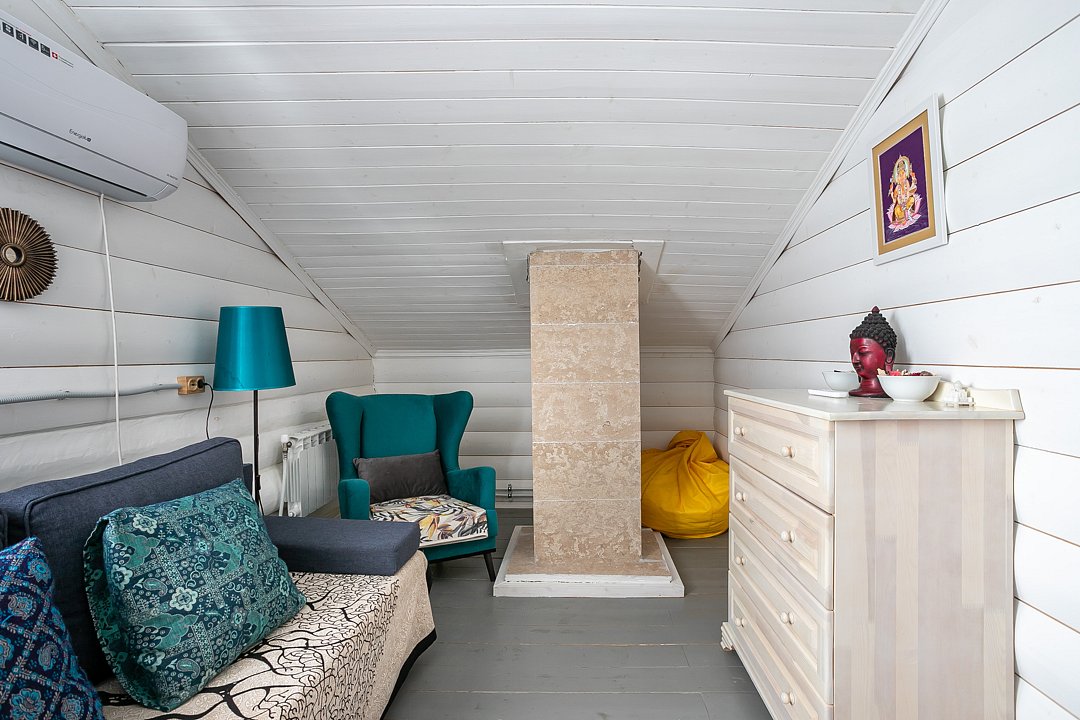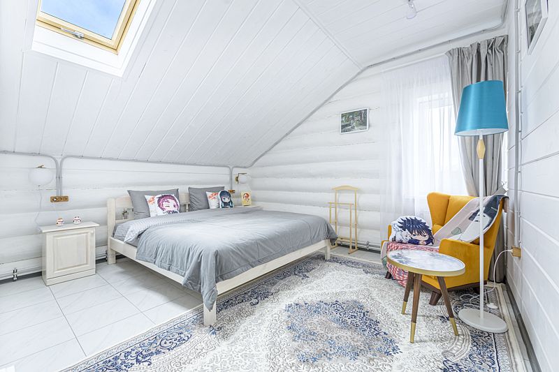 На втором этаже дома просторная спальня с кроватью размером 200х200, в холле — двуспальный диван, а также еще одна гостиная с двуспальным диваном. В доме установлен кондиционер. На первом этаже — теплый пол, столовая и русская печка.