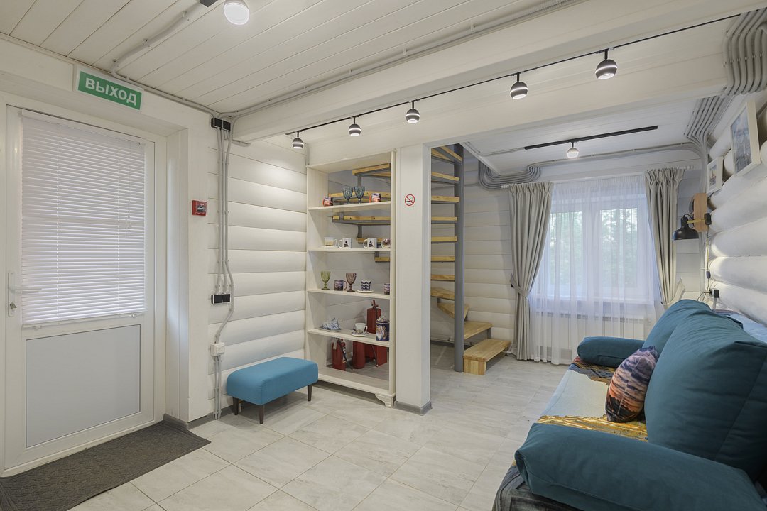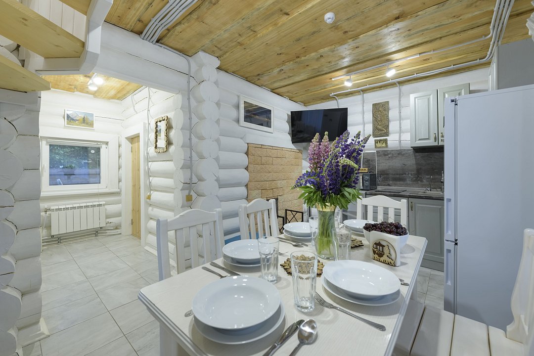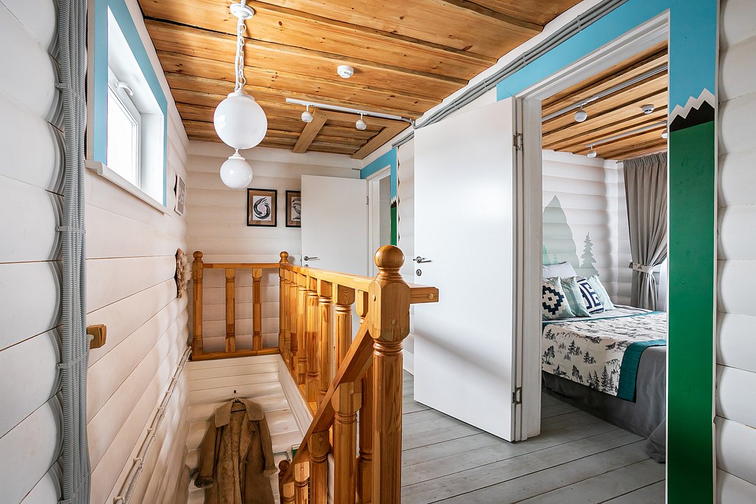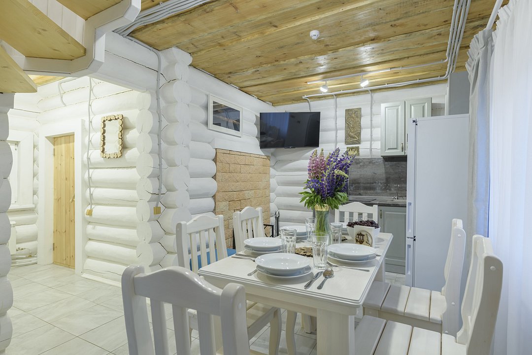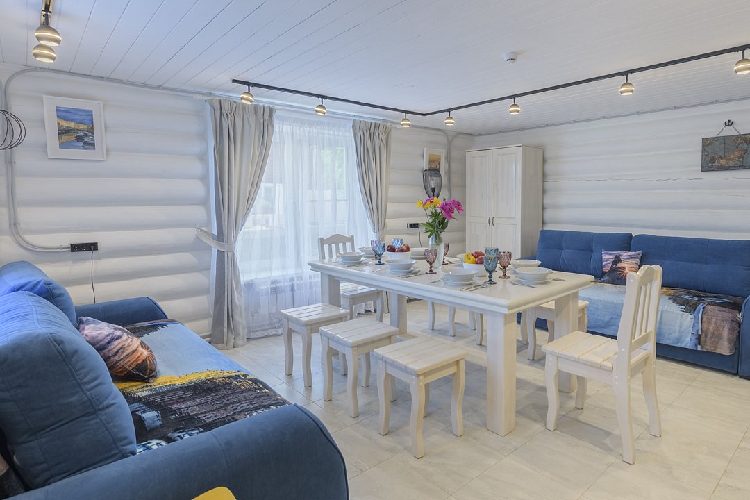 На втором этаже расположены три спальни с кроватями размером 180х200, в одной комнате есть двуспальный диван. На первом этаже находятся гостиная-столовая, туалетная комната и душевая кабина. Имеется кондиционер. Русская парная рассчитана на четыре-шесть человек.
