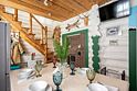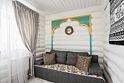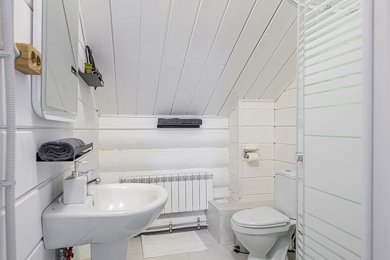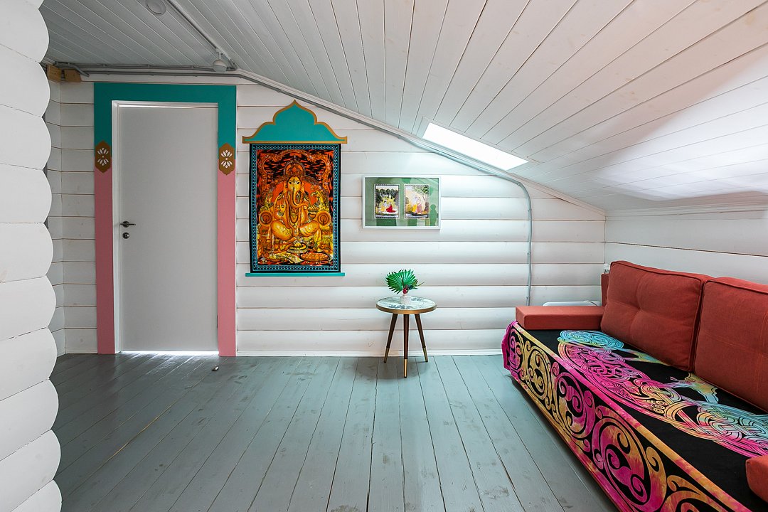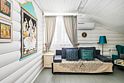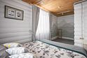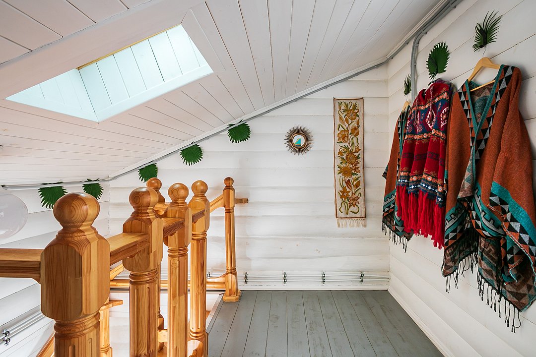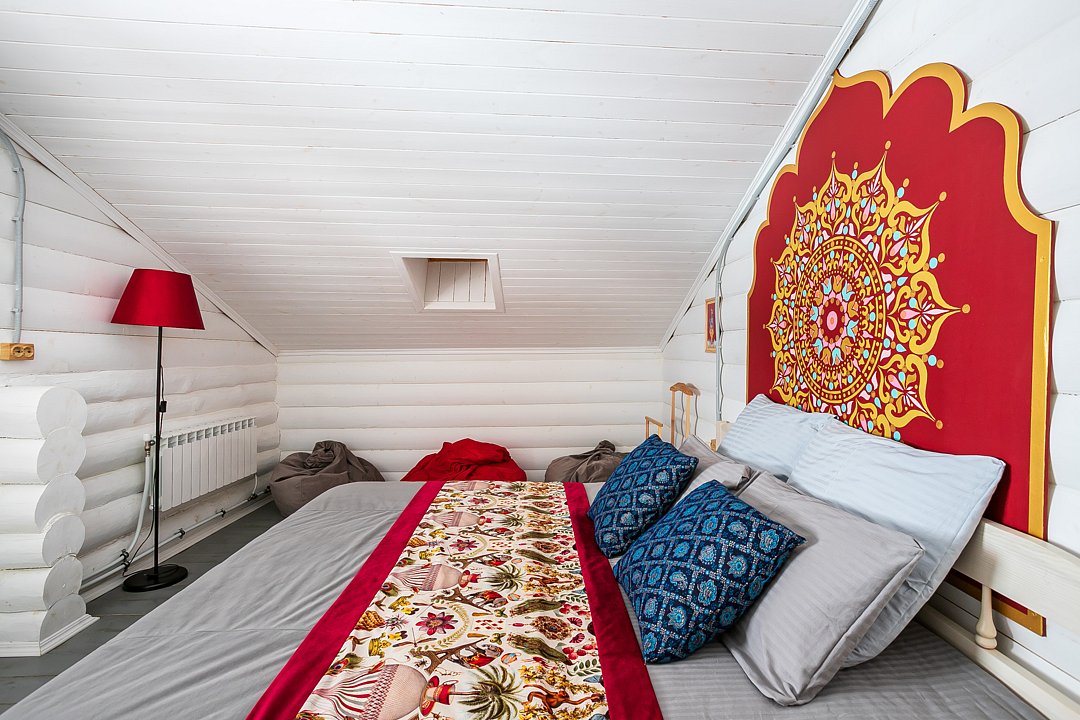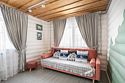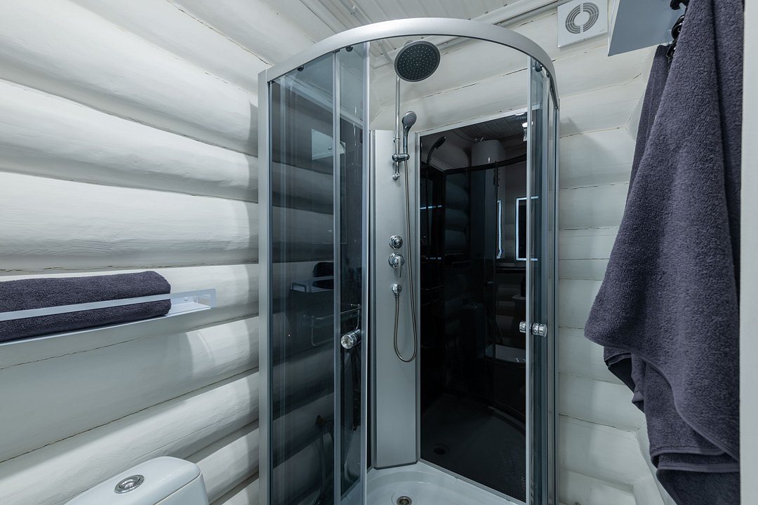 На втором этаже расположены три спальни с кроватями размером 180х200, в одной комнате есть двуспальный диван. На первом этаже находятся гостиная-столовая, туалетная комната и душевая кабина. Имеется кондиционер. Русская парная рассчитана на четыре-шесть человек.