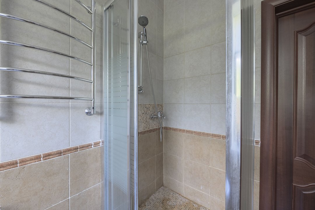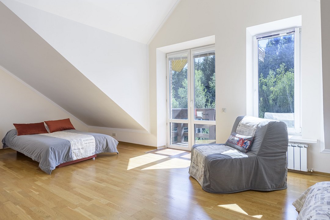 На втором этаже две спальни с кроватями 200х200, одна спальня с кроватью 160х200. Двуспальный диван 160х200 в холле на втором этаже, такие же диваны на первом этаже в спальне и в гостиной. На пеpвом этaже также кухня с русской печью; ванная комната с душевой кабиной, совмещенная с санузлом; теплый пол. Есть кондиционер.