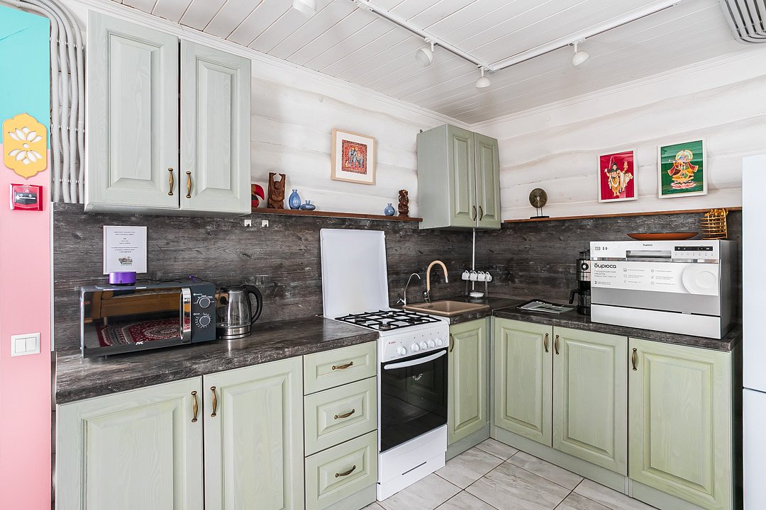 В распоряжении гостей кухня со всем необходимым: свч, кофе-машина, чайник, посудомоечная машина, обеденная зона. Белье, посуда предоставляется. Есть личная мангальная зона с принадлежностями для мангала и барбекю.