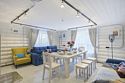 Две спальни с кроватями 200х200 и одна спальня с двуспальным диваном 160х200 на втором этаже, одна спальня с кроватью 160х200 на первом. Двуспальные диваны 160х200 в гостиной первого этажа и в холле второго этажа. Есть кондиционер. Ванная комната, совмещенная с санузлом, на каждом из этажей.