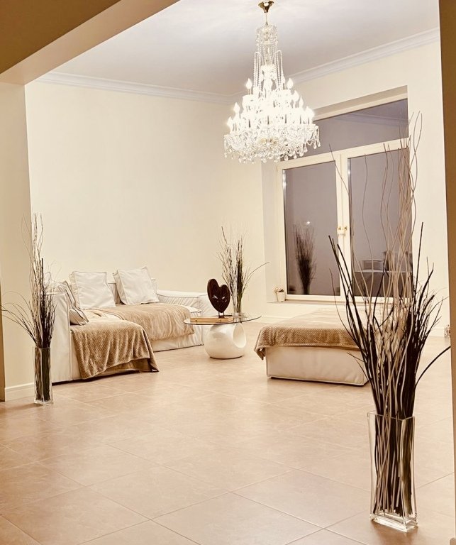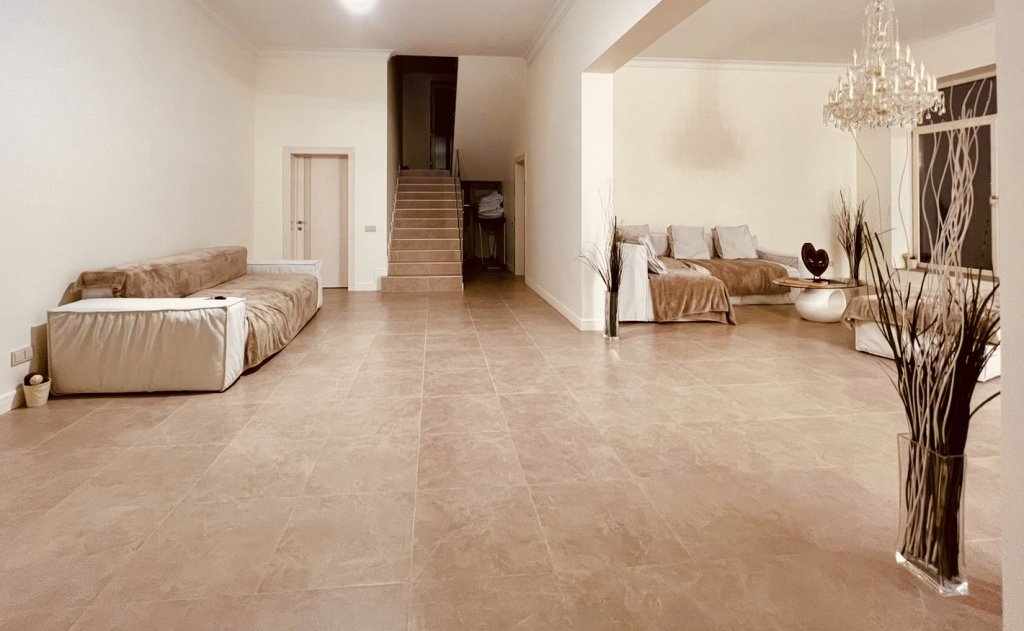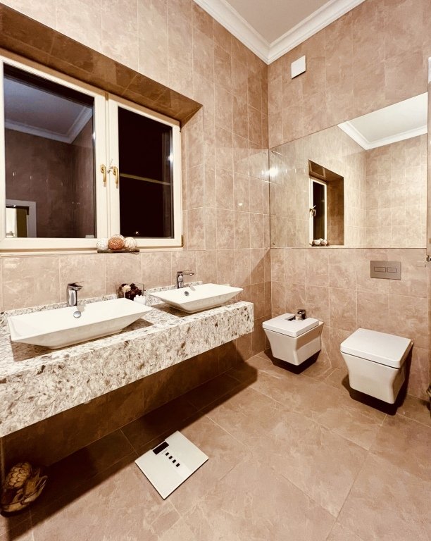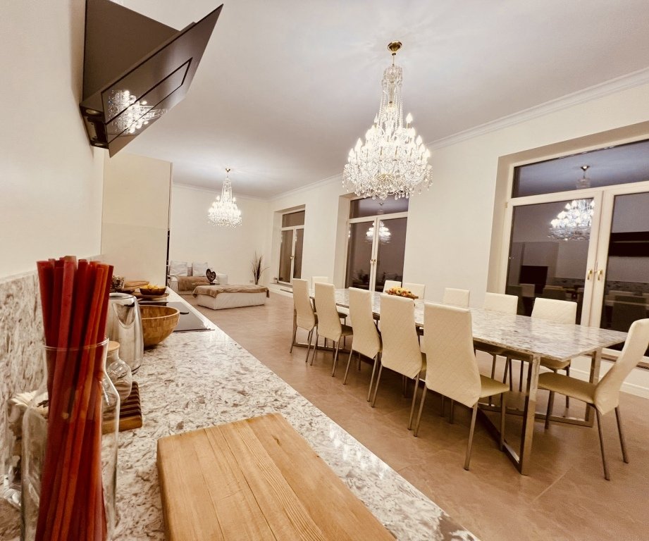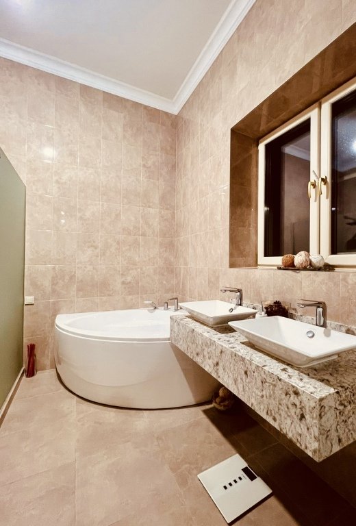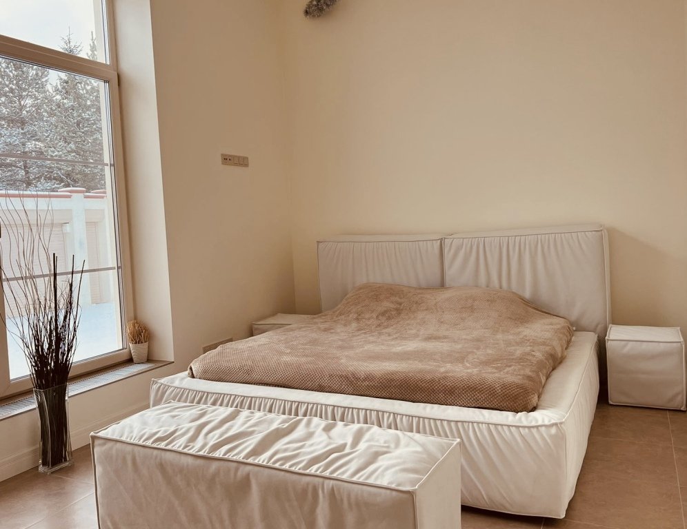 Коттедж состоит и 2 этажей, 440 кв. м. 1 этаж: кухня-гостиная с установленной техникой, столешница керамогранит, полы с подогревом. 3 спальни, 2 уборные, фильтрованная вода из крана. 2 этаж: 3 спальни, кедрово-соляная сауна, кинозал, бильярдный зал, 1 уборная.