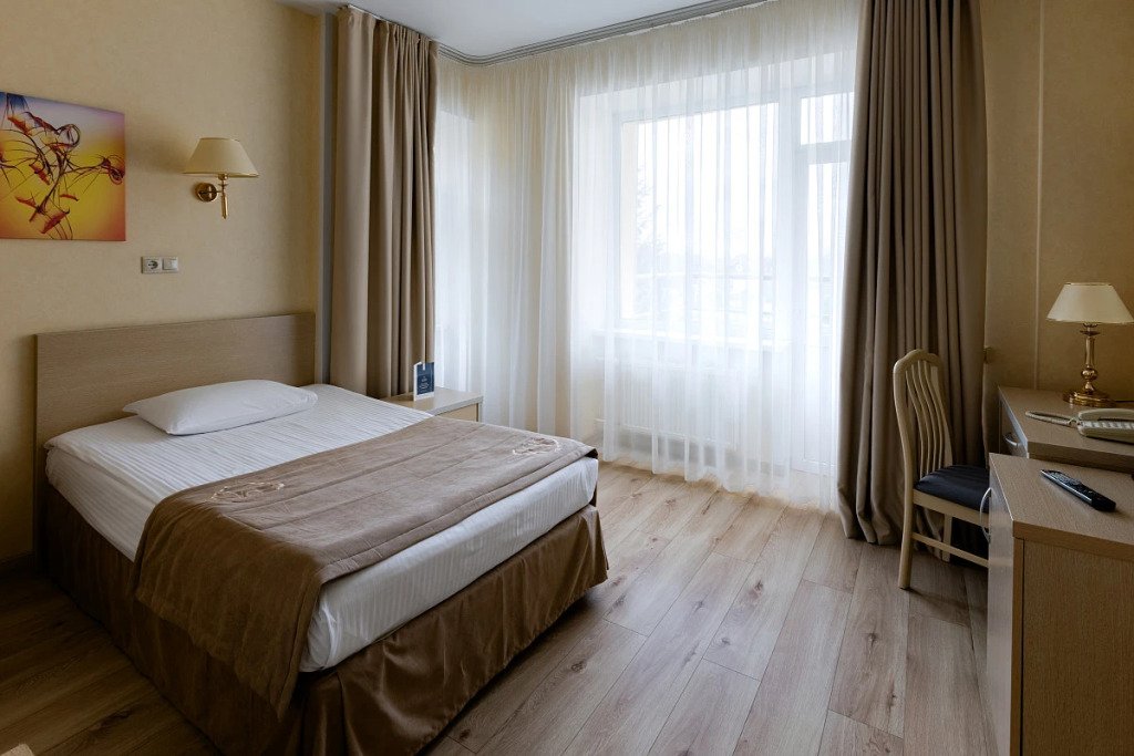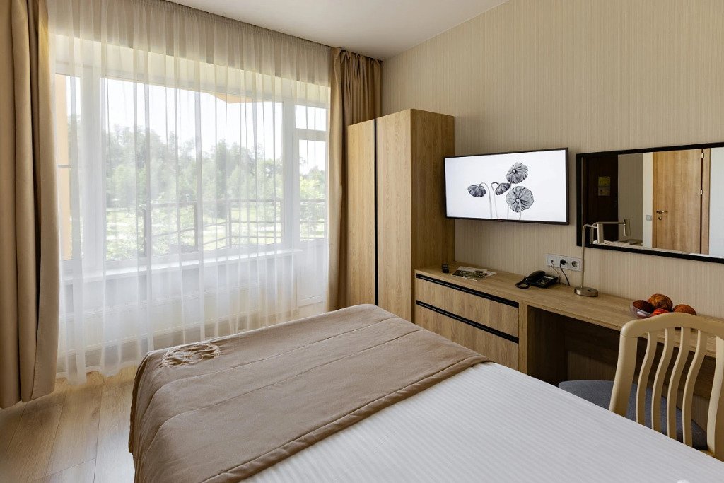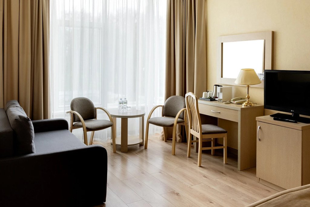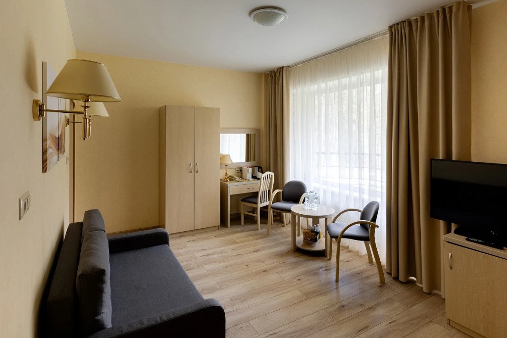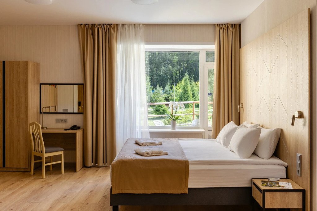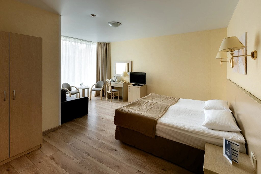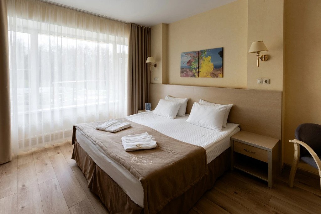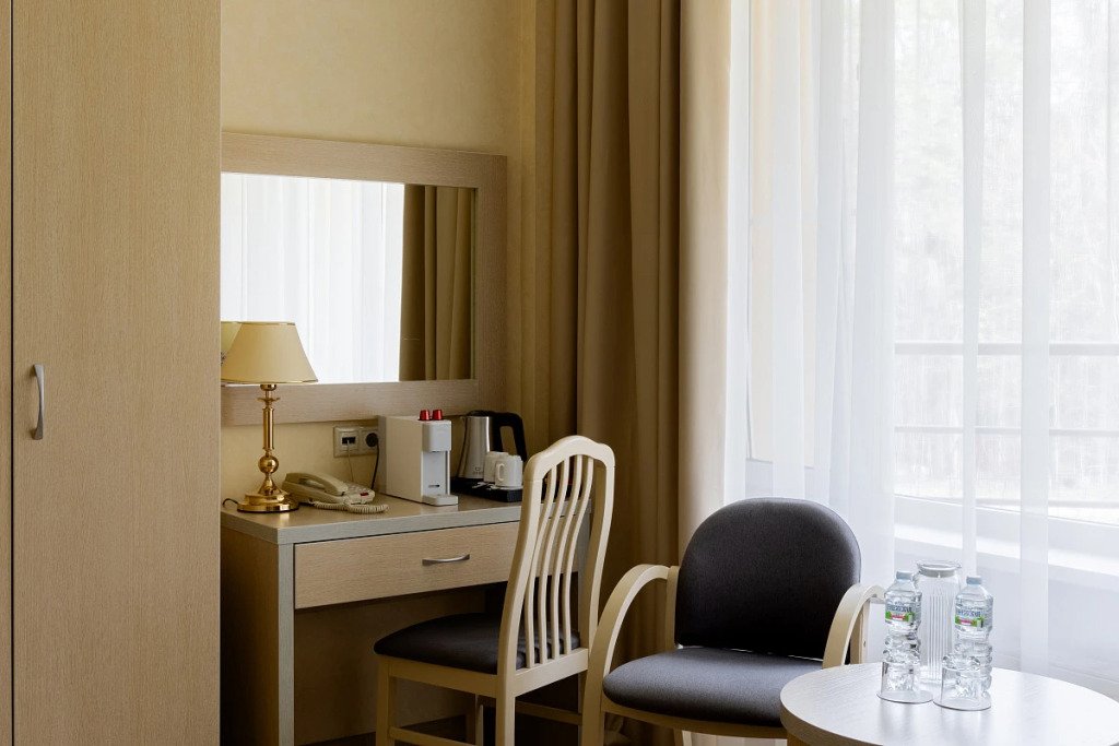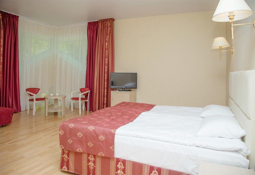 Путешествие с паройОтличное место для отдыха!Прекрасный курорт! Близко, чудесный сосновый воздух, лес, лавочки, территория полностью обустроена. Питание шведский стол - разнообразно, вкусно, на любой выбор. Номер был с балконом. Уборка ежедневно, смена белья через 3 дня. Отличное лечение (входило в стоимость) - массаж (огромное спасибо массажисту Роману), грязи, физиотерапия, галокамера. Бассейн и сауна тоже входили в путевку. Мы уже 7 лет здесь отдыхаем, имеем карту на скидку 20%, а также плюс скидка пенсионерам тоже 20%. Так что прямой резон отдыхать здесь. Ну и главное, здесь тихо, нет шумов. Птички поют за окном и сосны... Лучше места нет!...