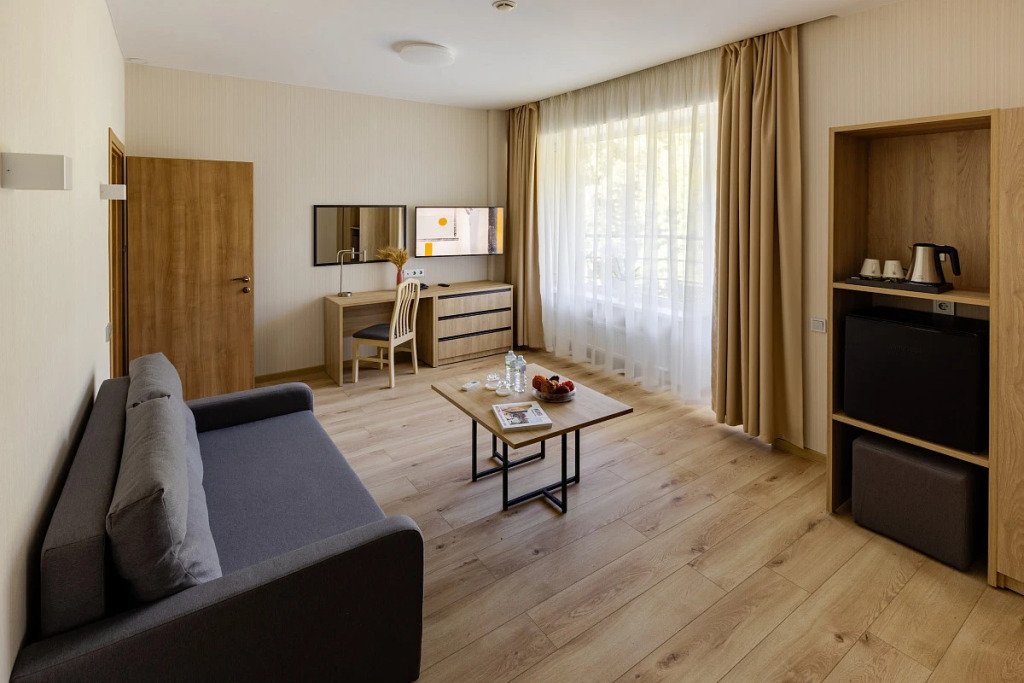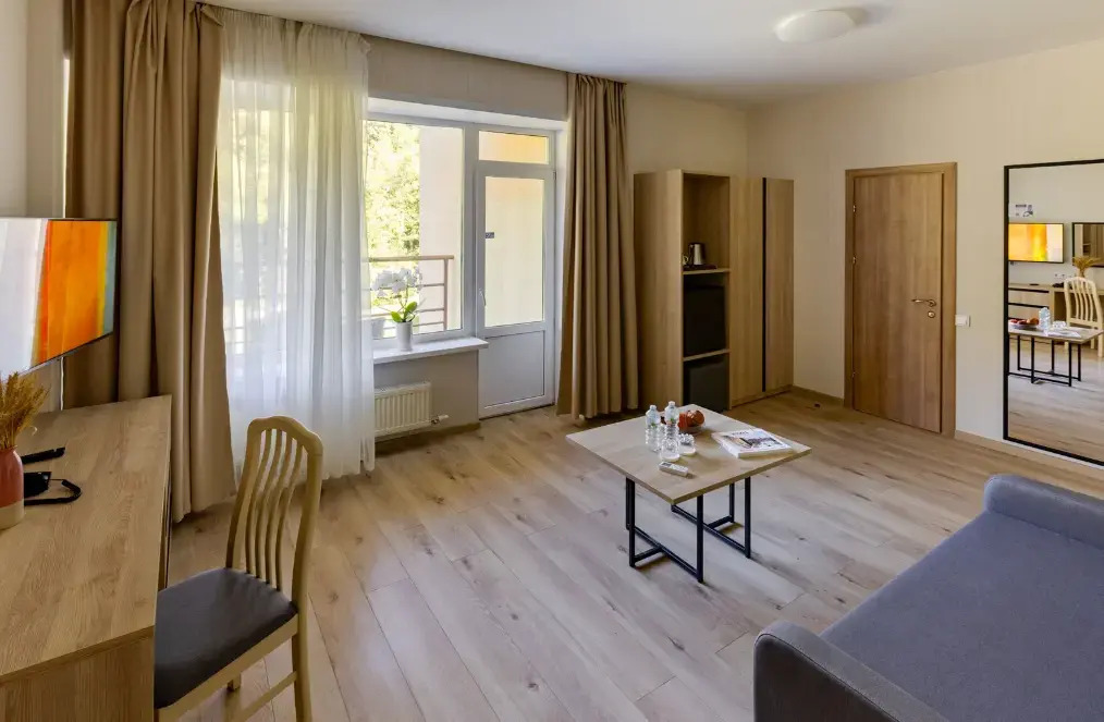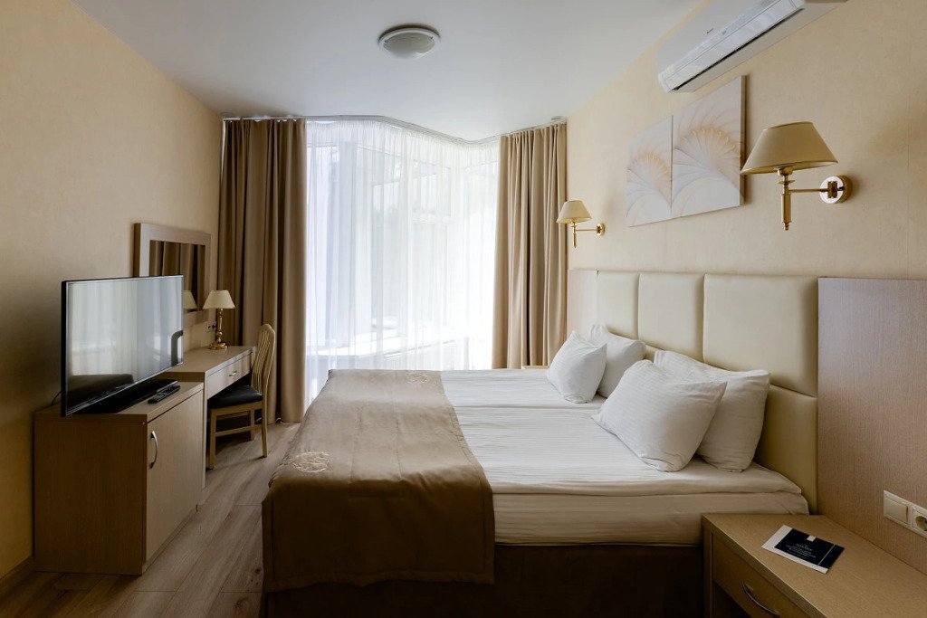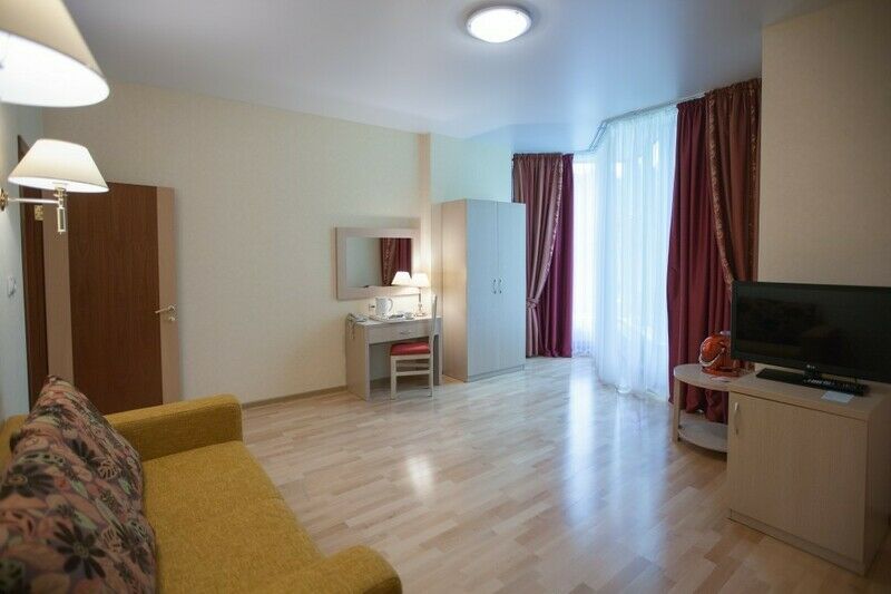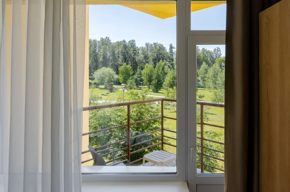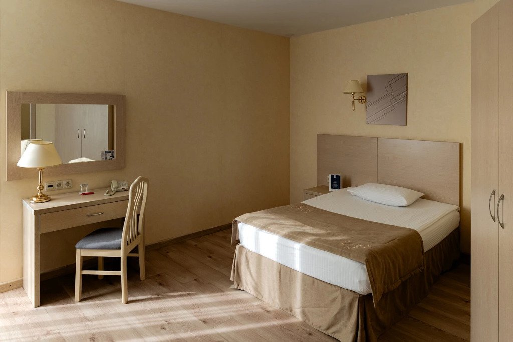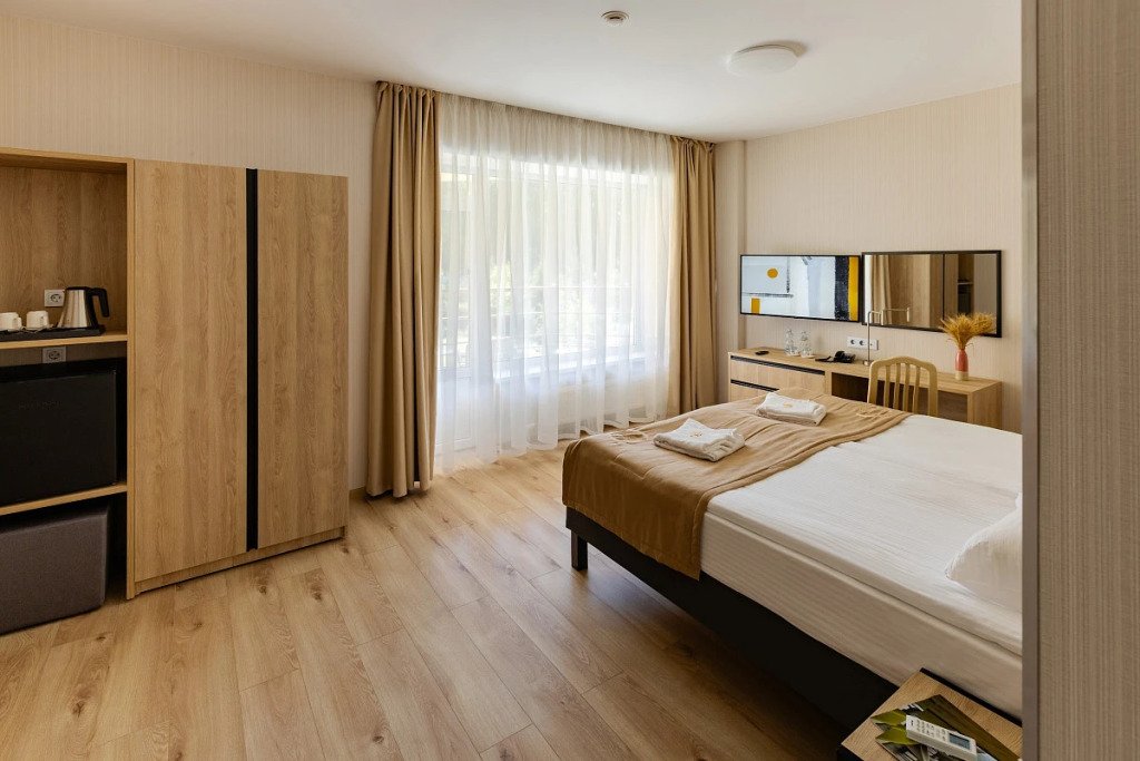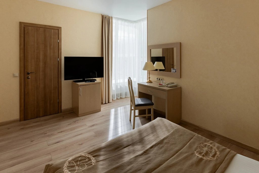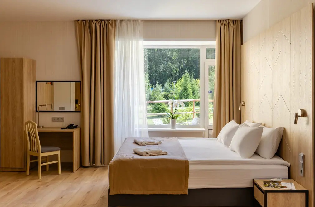 Путешествие с паройОтличное место для отдыха!Прекрасный курорт! Близко, чудесный сосновый воздух, лес, лавочки, территория полностью обустроена. Питание шведский стол - разнообразно, вкусно, на любой выбор. Номер был с балконом. Уборка ежедневно, смена белья через 3 дня. Отличное лечение (входило в стоимость) - массаж (огромное спасибо массажисту Роману), грязи, физиотерапия, галокамера. Бассейн и сауна тоже входили в путевку. Мы уже 7 лет здесь отдыхаем, имеем карту на скидку 20%, а также плюс скидка пенсионерам тоже 20%. Так что прямой резон отдыхать здесь. Ну и главное, здесь тихо, нет шумов. Птички поют за окном и сосны... Лучше места нет!...