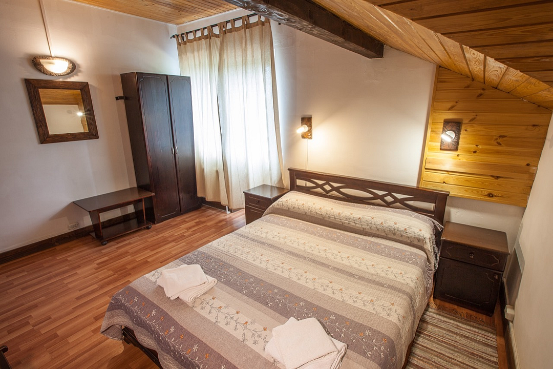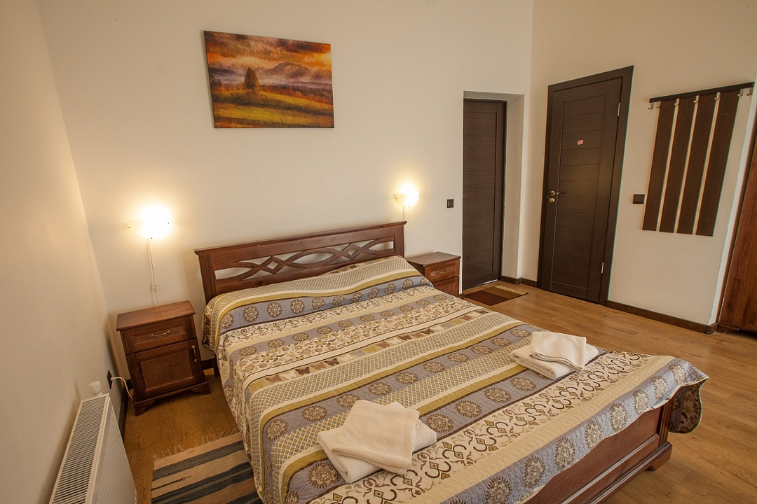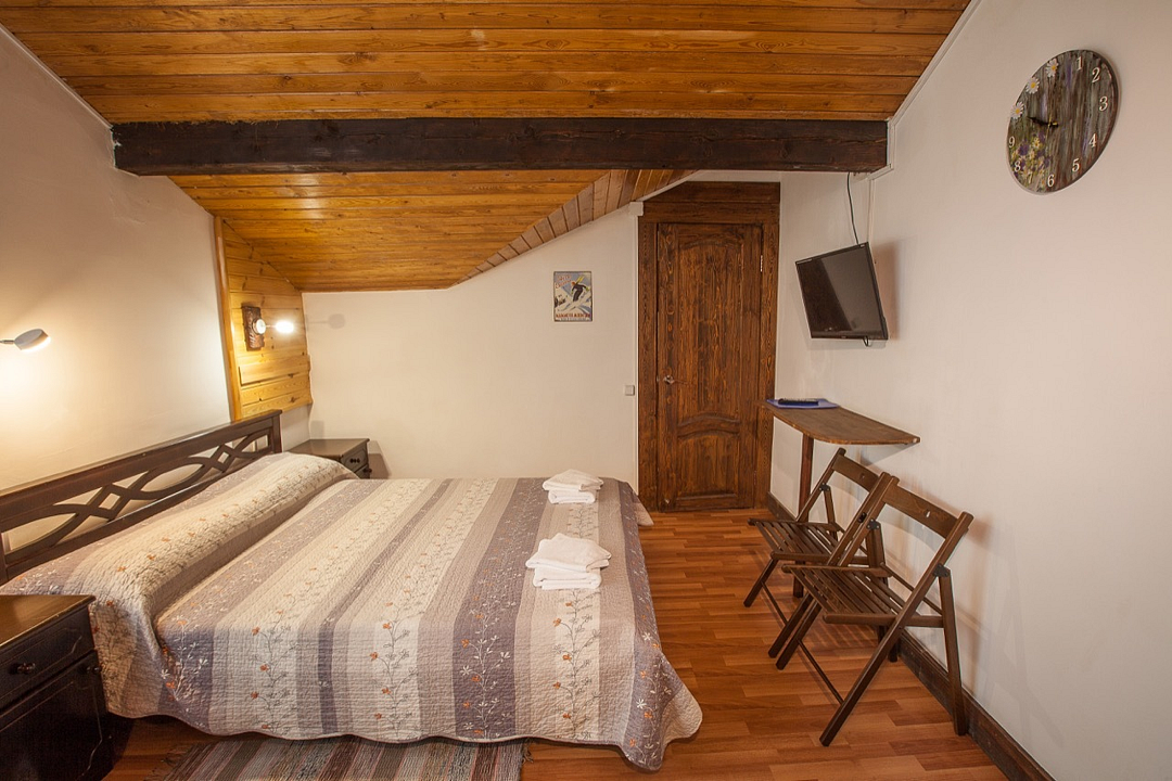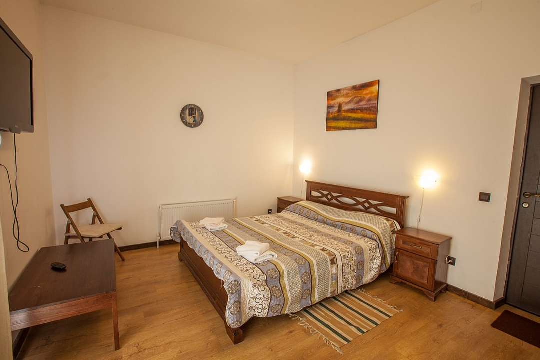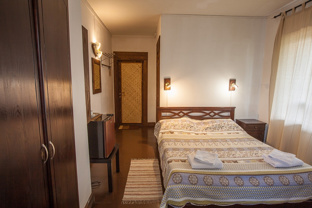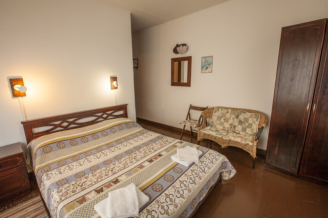 Однокомнатный номер с балконом и террасой, с одной двуспальной кроватью. Совмещенный санузел с душевой кабиной. В стоимость проживания входит завтрак.
