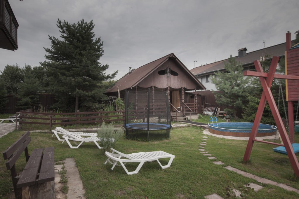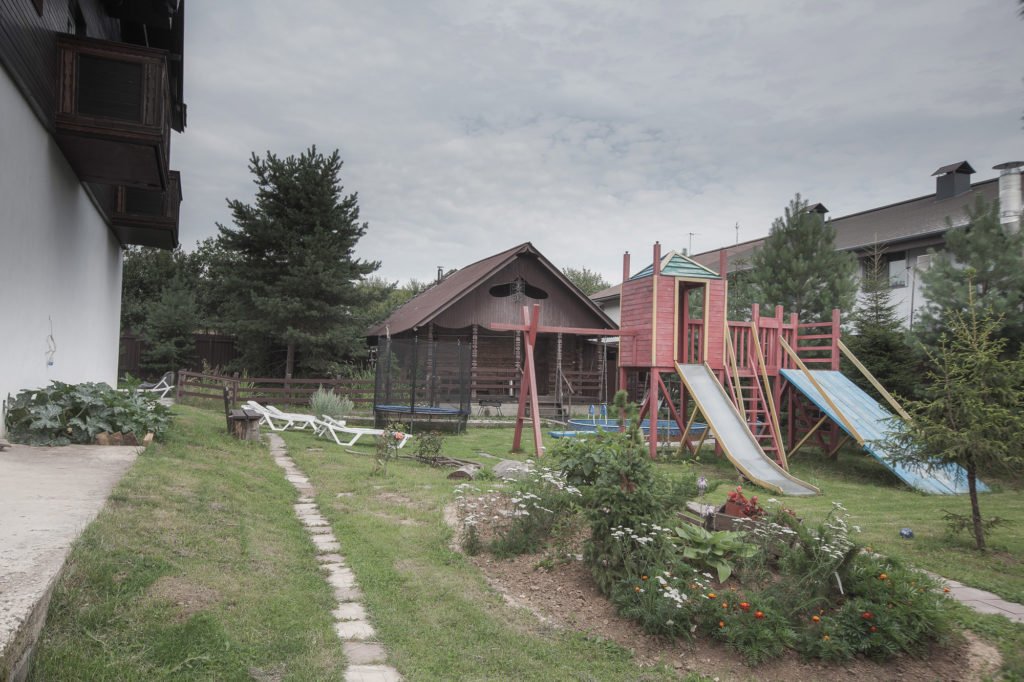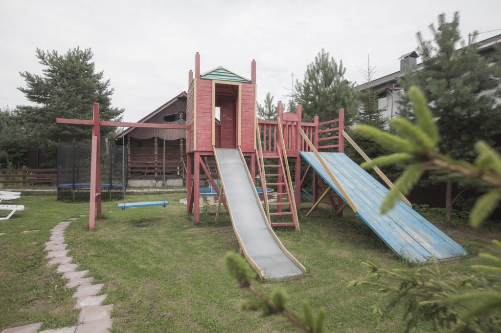 Для развлечений и игр на свежем воздухе для ваших детей оборудована детская площадка с батутом и горками.
