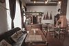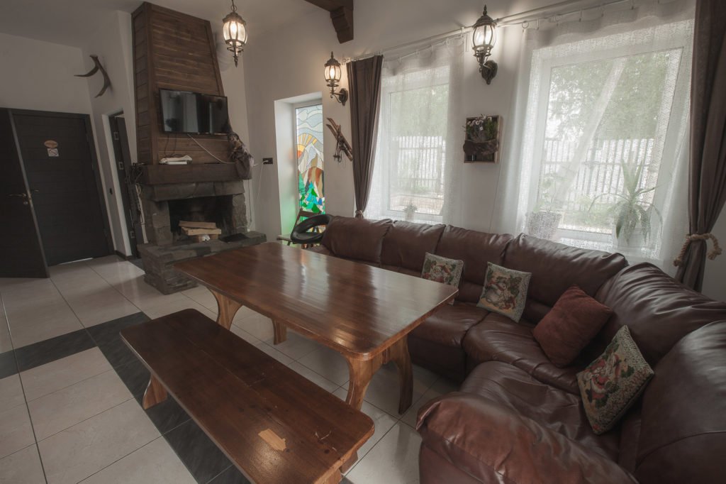 Можно приятно провести вечер в теплой гостиной, декорированной шкурами, с камином и деревянными столами, декорированной шкурами.