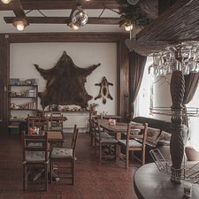 На стене в обеденном зале медвежья шкура и чья-то ещё поменьше, кажется барсук.