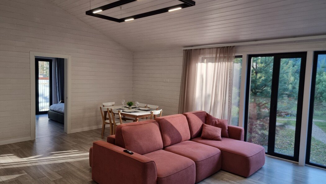 Большой дом Барнхаус 81 кв. м + 23 кв. м терраса, расположенный на участке 30 соток, на первой линии Можайского водохранилища. Дом состоит из большой кухни-гостиной, двух спален, небольшой комнаты с диванчиком для отдыха, прихожей и санузла. Подойдёт для тихого семейного отдыха. Вечеринки запрещены. Дом оборудован современной новой техникой и всем необходимым для приятного отдыха. Отопление тёплым полом. Шикарные виды из панорамных окон не оставят вас равнодушными. На территории костровая зона, которая позволит вам с удовольствием посидеть у костра в компании друзей и любимых. Есть мангал и барбекю. Выйдя из калитки вы попадаете в сосновую лесополосу, которая идёт вдоль берега водохранилища, прогулки выходят просто замечательными. Пляж и береговая линия практически сразу за калиткой. Для гостей доступен прокат сапбордов и велосипедов. В пешей доступности остатки усадьбы Горетово и старая церковь. В соседней деревне небольшой зоопарк. В 40-50 минутах езды шикарный сафари-парк с дикими животными, аэроград Можайский, где можно полетать на самолёте. В 30 минутах езды можно замечательно провести время катаясь на лошадях. В Можайске есть такой досуг как кинотеатр, бассейн и т.п. Любителям пара можно арендовать баню на турбазе, которая находится в 200 метрах. В 5 минутах на авто находятся сетевые магазины и пункты выдачи.