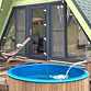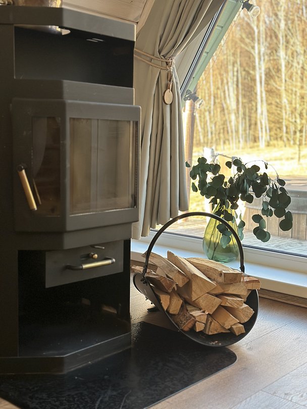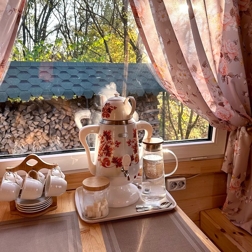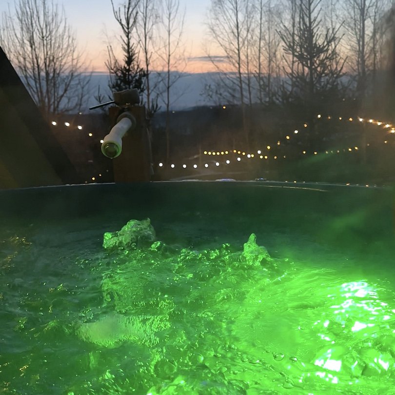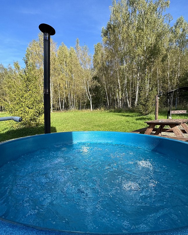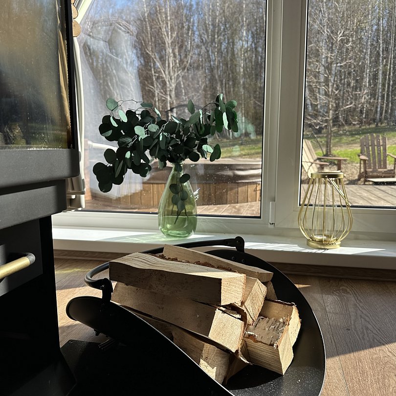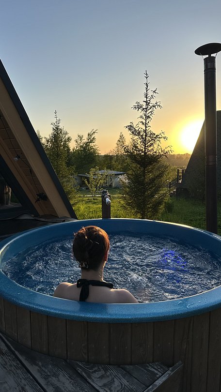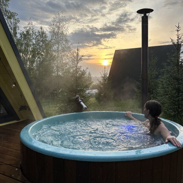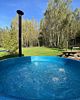 На террасе каждого домика установлена современная купель с гейзером и подсветкой, с дровяным подогревом — Фурако. Это отличный способ расслабиться и оздоровиться с прекрасным видом на лес и Оку в любую погоду!