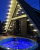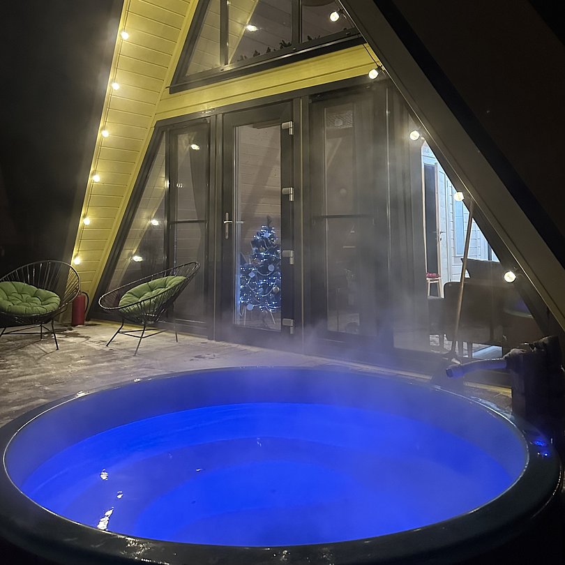 На террасе домика установлена купель — Фурако с гейзером и подсветкой (топка купели оплачивается отдельно).