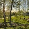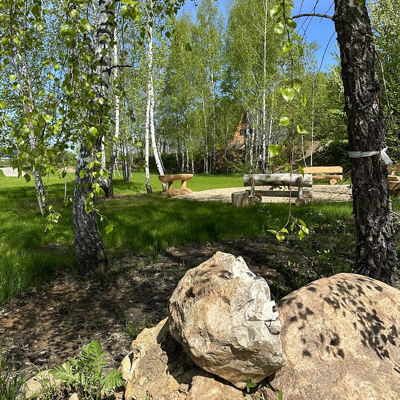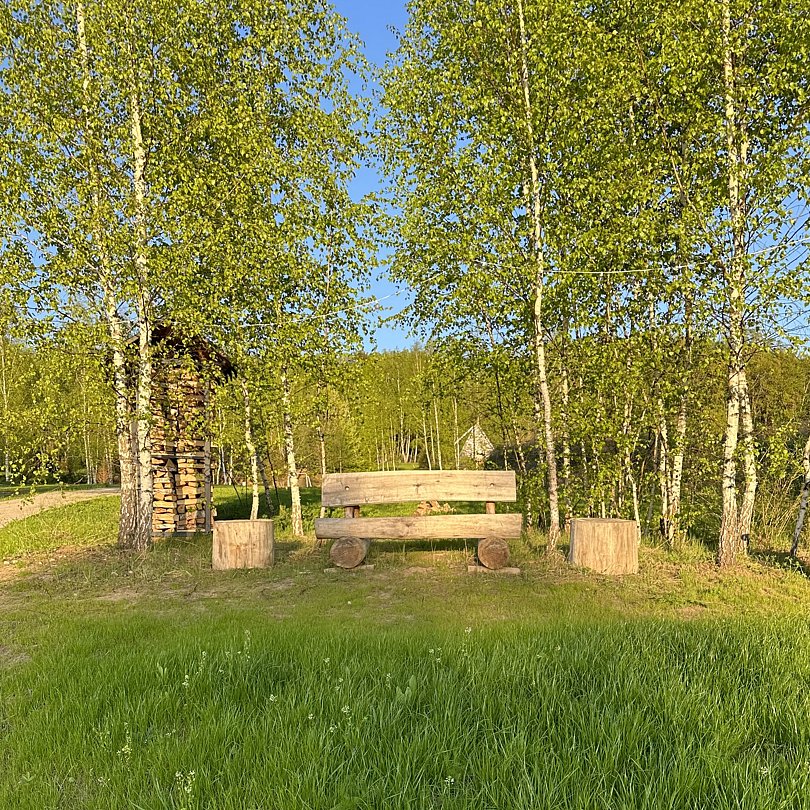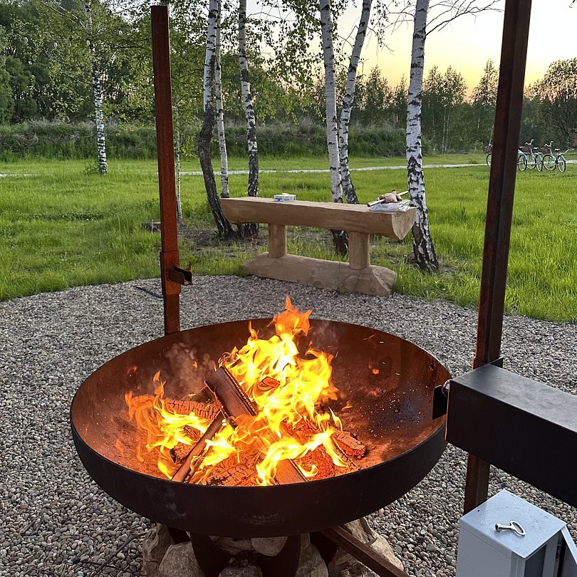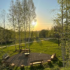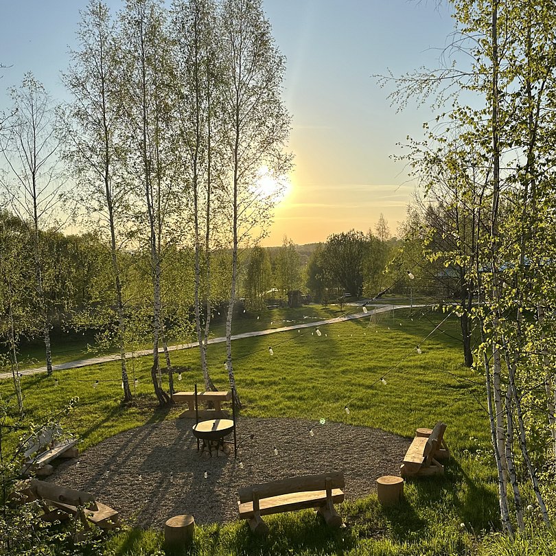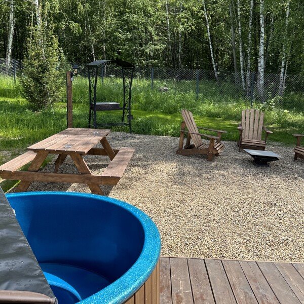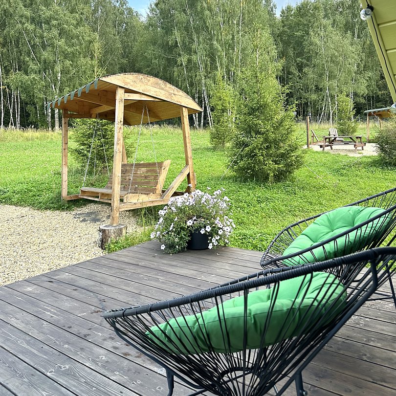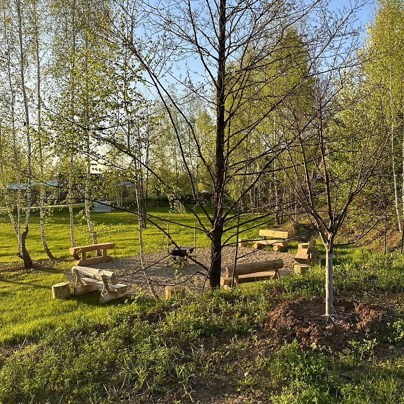 Участок огороженный еловой изгородью — 150 кв.м, на котором вы найдете личный мангал, удобную уличную мебель, деревянные качели, стол с лавочками и костровую чашу для приятных вечеров под звездами.