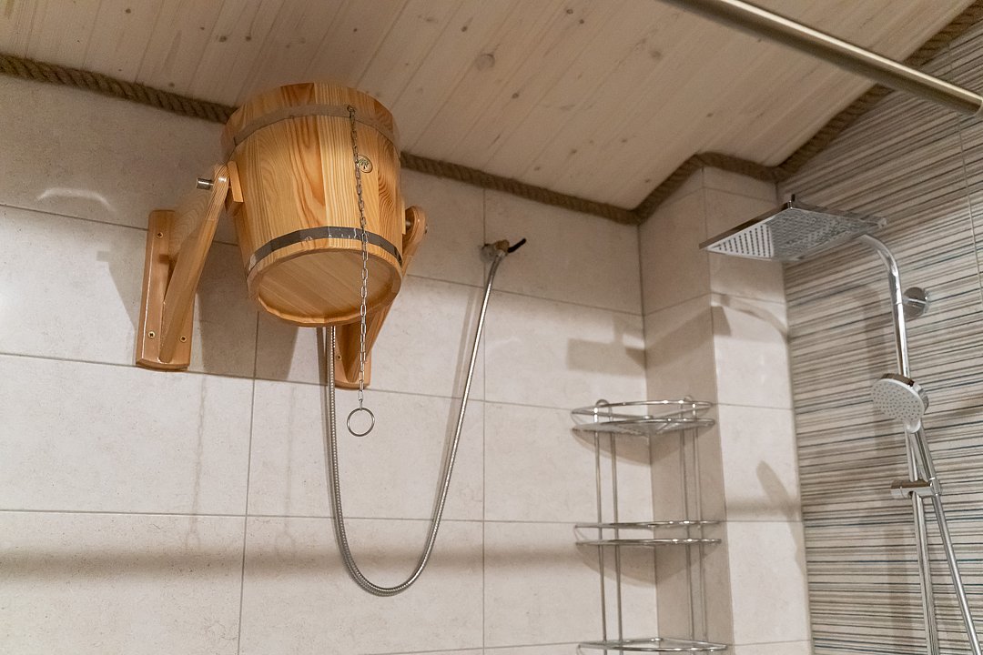 Инфраструктура: тапочки, купель, зона отдыха, полотенца, простыни, шапочки, душБаня с видом на реку Дубна, большой террасой, парной, гостиной зоной и, конечно, кедровой купелью, которую можно наполнить разнотравием.