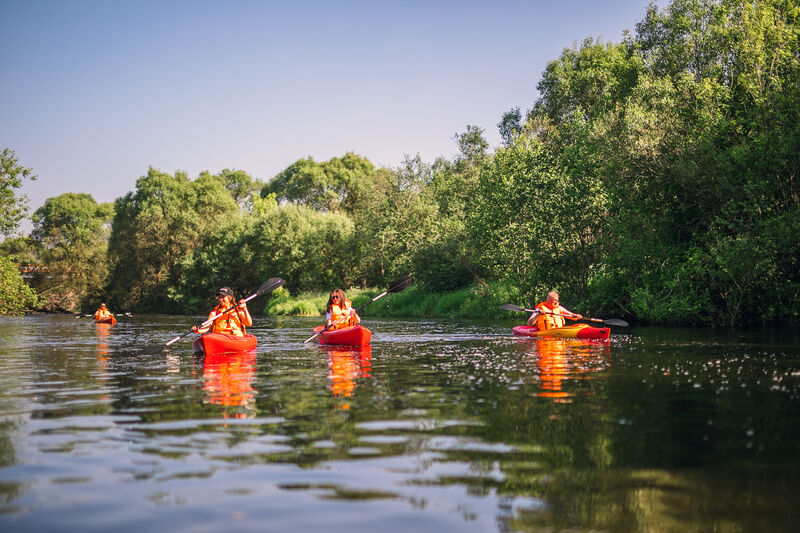 Сезон катания на каяках по реке Дубна открывается в мае. Индивидуальные и групповые сплавы по маршрутам протяженностью 3 км (1 час) или 12 км (3 часа). Река Дубна идеальна для сплава на каяках: чистая, почти прозрачная вода, спокойное течение, затоны для отдыха. Дубна подходит как для сплава всей семьей на относительно небольшой скорости, так и для спортивного сплава. Ограничения по возрасту: с 7 лет.