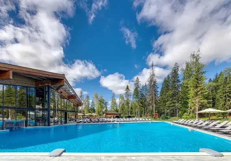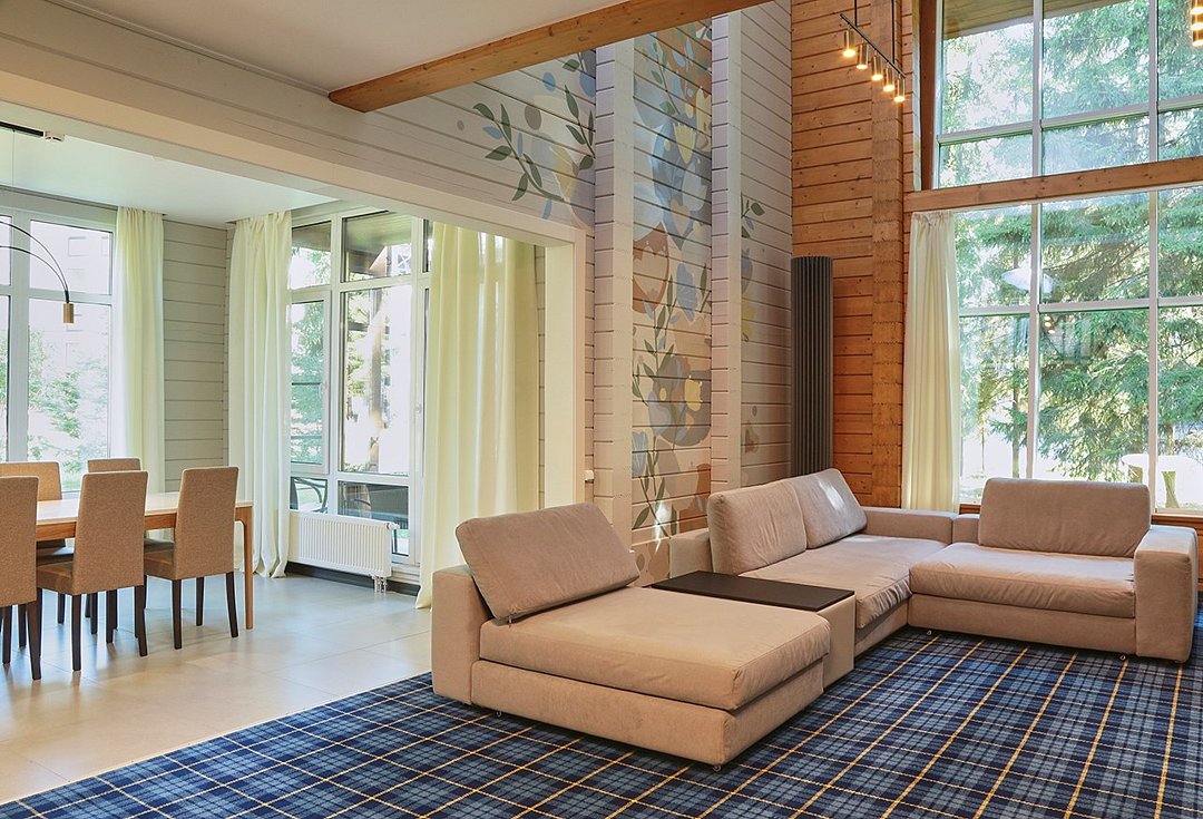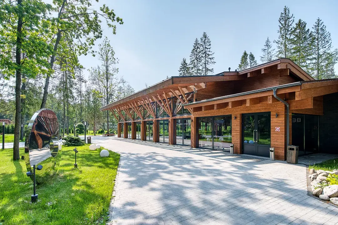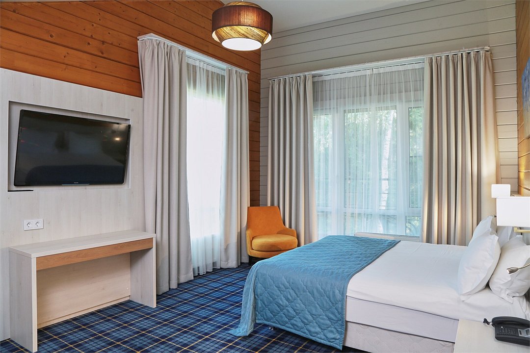 Загородный отель имеет 4 звезды категории, но главное даже то, что он расположен в живописном лесном массиве к западу от Москвы и может похвастать вязким и чистым воздухом. Помимо основных 250 номеров для проживания предложены десять деревянных коттеджей. Внутри каждого – уютная и полная меблировка, вся необходимая техника и аксессуары. Между каждым из коттеджей пролегает расстояние в 200-400м, так что гости чувствуют себя непринужденно на своей отдельной территории.
