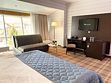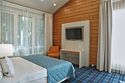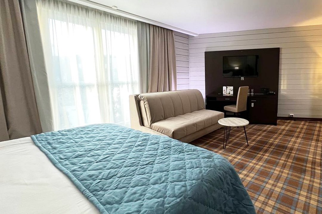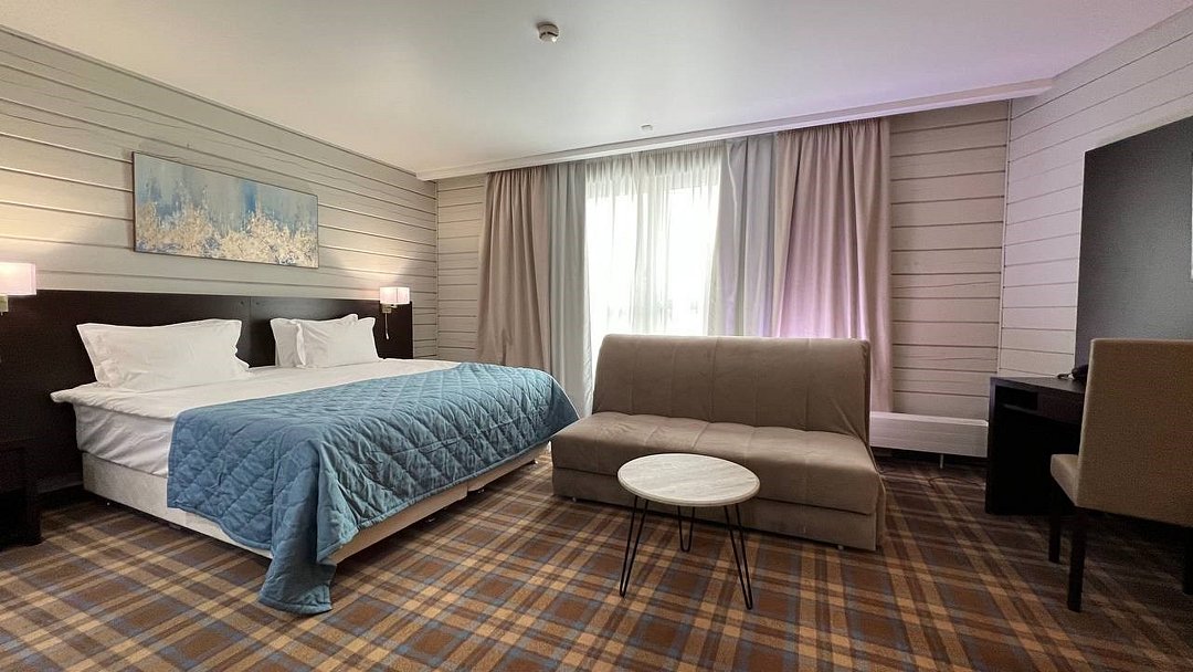 Четырехместный однокомнатный номер с панорамным окном во всю стену, откуда отрывается великолепный вид на территорию отеля.