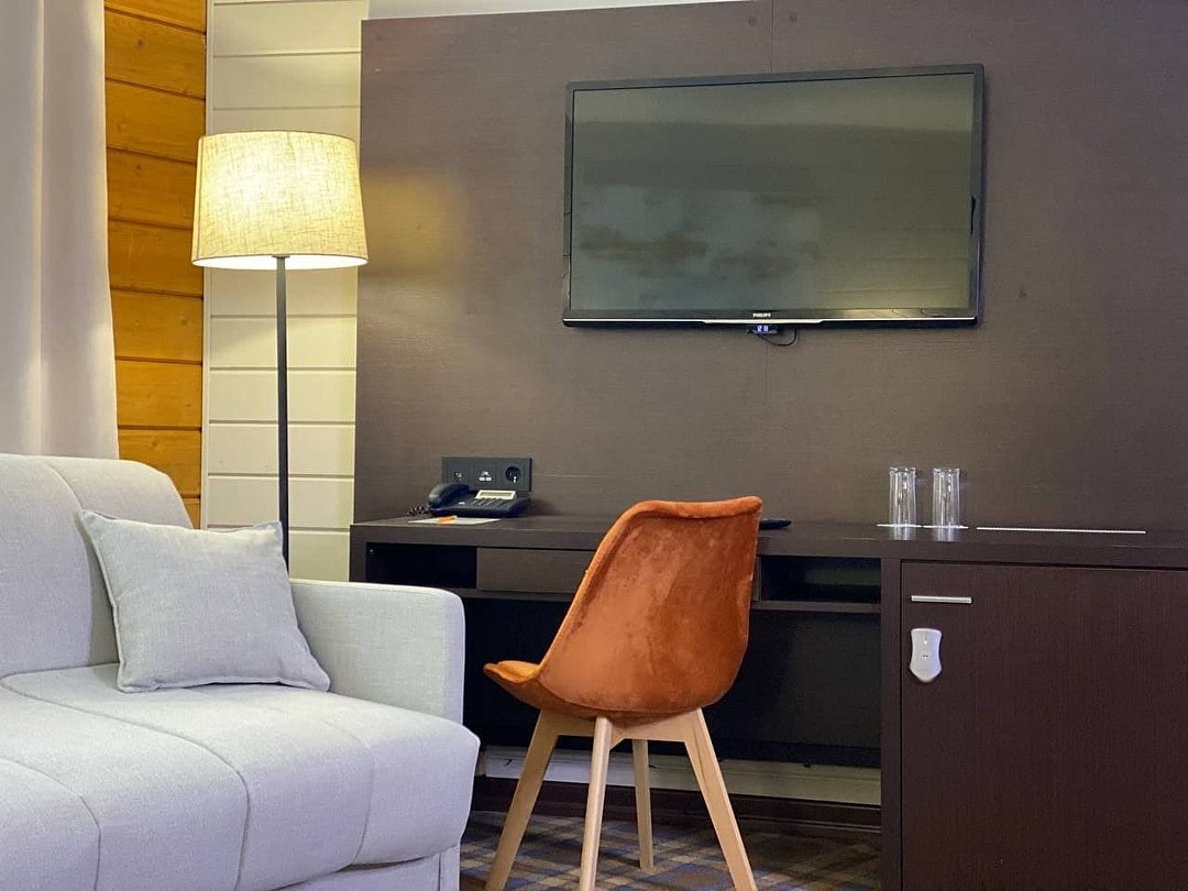 Кровать-трансформер на выбор: большая двуспальная или две раздельные кровати; плазменный телевизор с большим экраном и эфирным цифровым ТВ; авторские картины от российского художника Голышевой Анны; бесплатный WI-FI; письменный стол и стул; прикроватные бра с дополнительным точечным освещением; багажная тумба; чайный столик; телефон; мини-бар; фен; кондиционер (в летний период); сейф; ванна; биде; индивидуальные наборы SPA-косметики; косметическое зеркало; диспенсер с гигиеническими пакетами халаты и тапочки.
