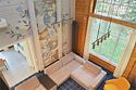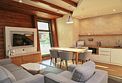На первом этаже коттеджа находятся: просторная гостиная с витражным окном высотой в два этажа, уютная спальня, столовая с кухонной зоной и выходом на веранду. Лестница наверх ведет к двум спальным комнатам, в одной из которых есть выход на балкон. Все спальни с ванными комнатами.