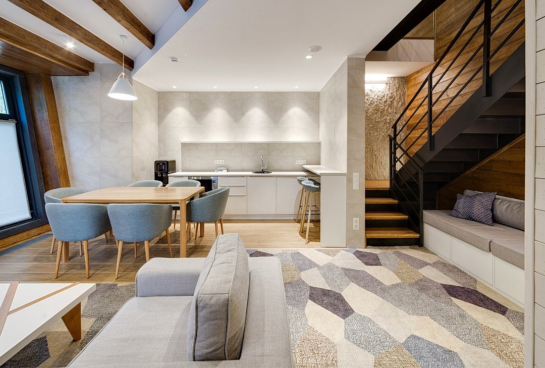 На первом этаже находится кухня-гостиная и гостевой санузел, на втором — 2 спальни с балконами и ванными комнатами. В номера категории «Pet» возможно заселиться с собачкой мелкой породы весом до 8 кг. В номере для питомца предусмотрена мягкая лежанка, мисочки и гигиенические пакеты для прогулки.