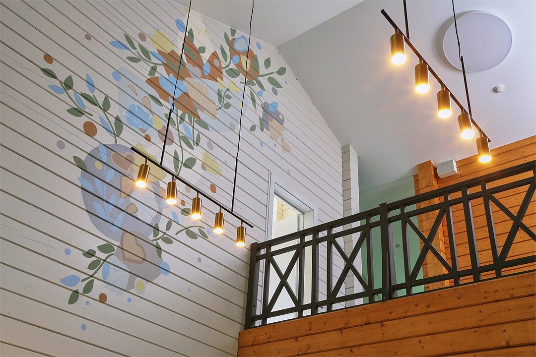 Детская развлекательная зона укомплектована сеткой для лазания, представляющей собой конструкцию трехметровой высоты, которая закреплена к потолку. Также в детской зоне есть бизи–боксы, игрушки и лазалки разных конструкций.
