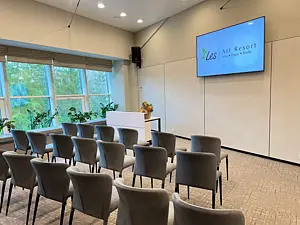 За панорамными окнами залов открывается вид на лес. Высокие потолки, мякгое ковровое покрытие созают максимально комфортную обстановку мероприятия.