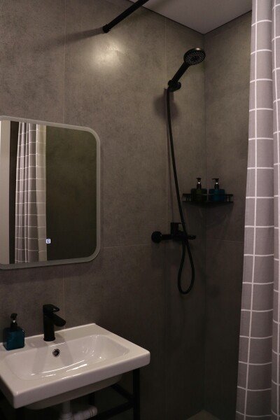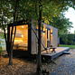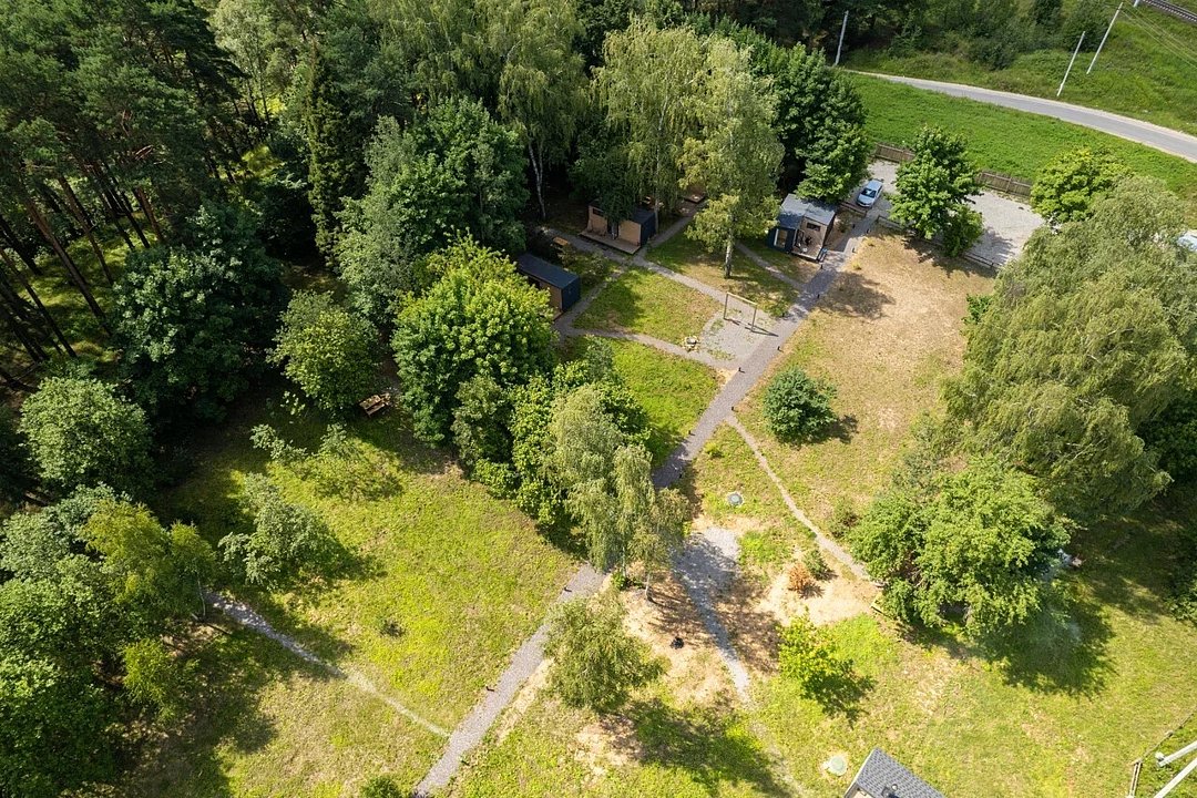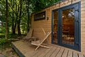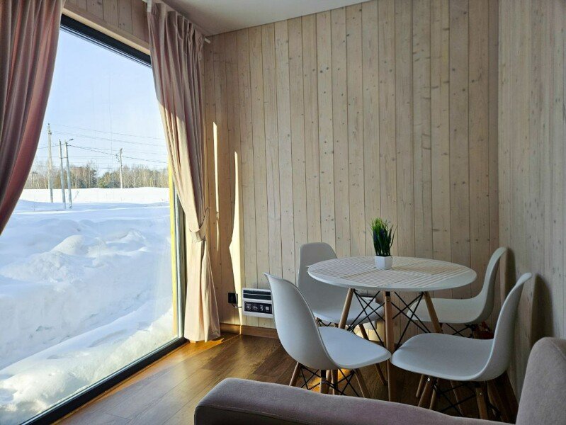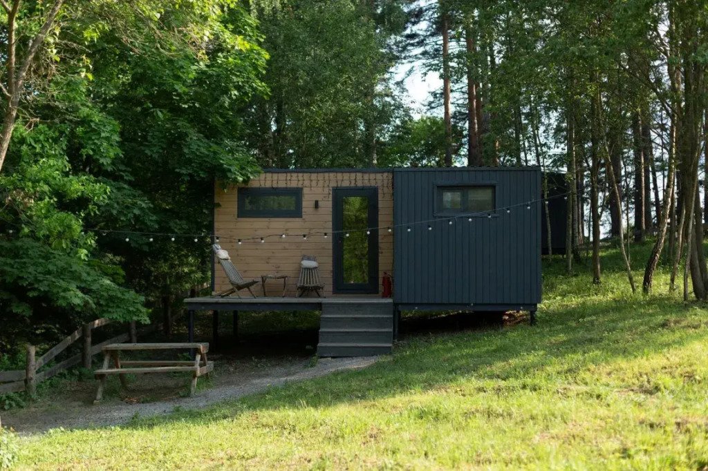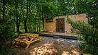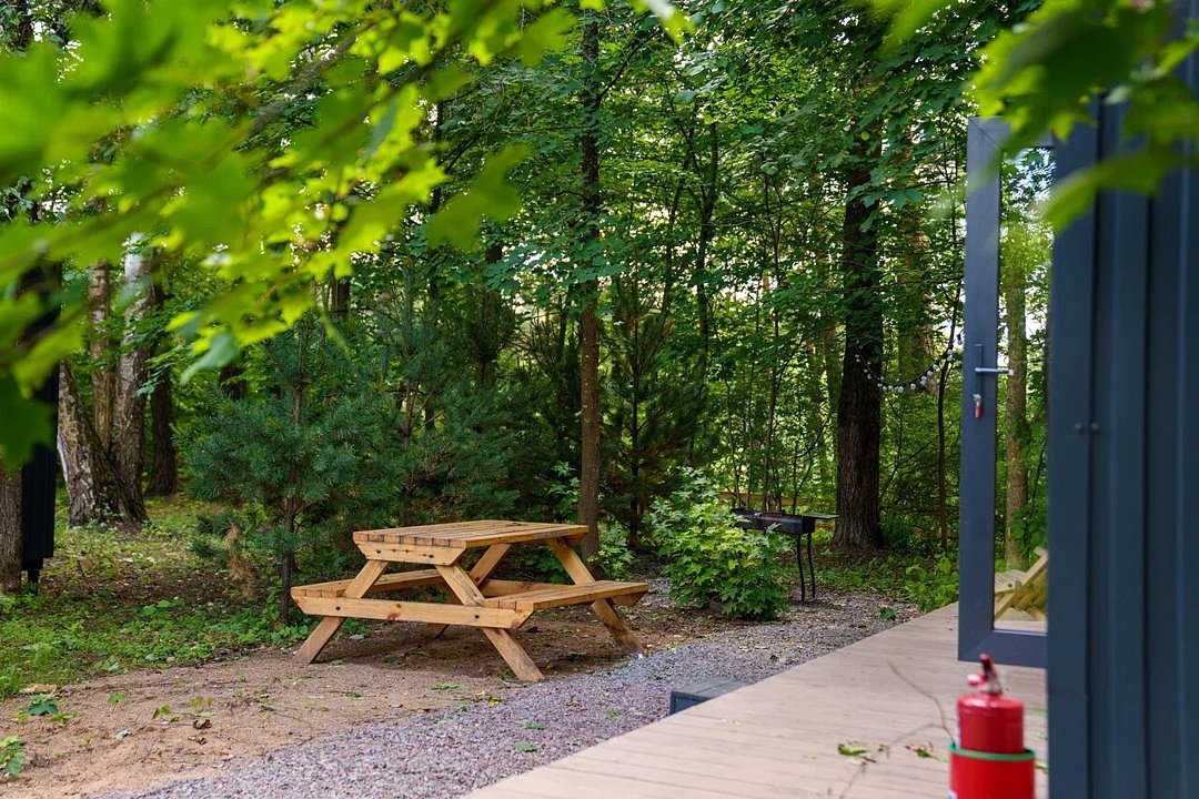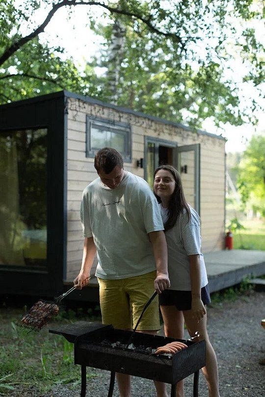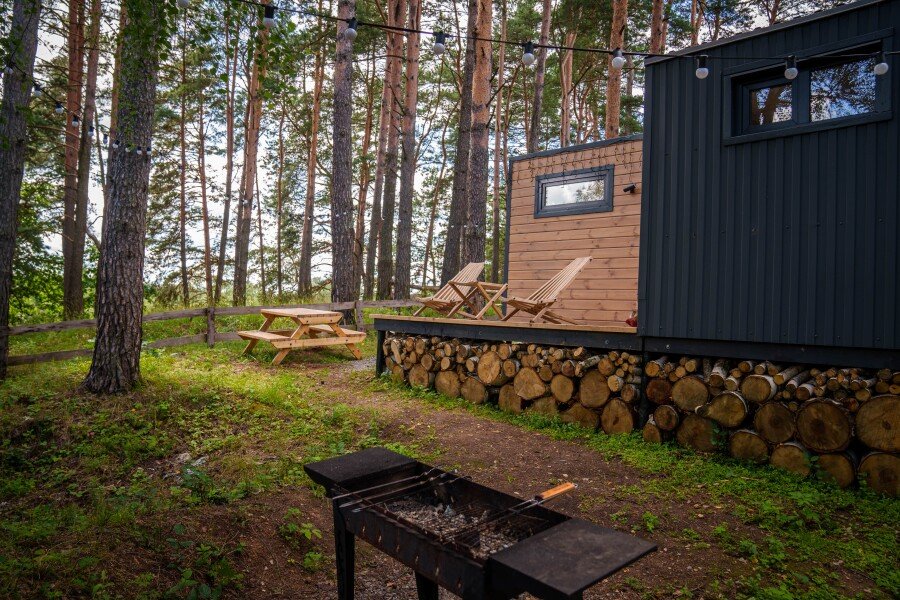 Домик среди сосен и берёз. Спальня, кухня и ванная комната. А самое главное — панорамные окна, чтобы просыпаясь, увидеть рассвет прямо из спальни и наблюдать малиновый закат из кухни-гостиной. Вечера лучше проводить на террасе с грилем и светящимися огоньками гирлянды. Рядом с домик есть доступ к ручью.