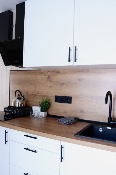 Небольшой уютный домик для двоих человек с собственным полностью укомплектованным санузлом, большой кроватью у панорамного окна, кухней и обеденной зоной.