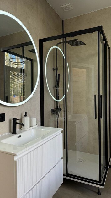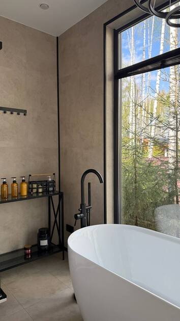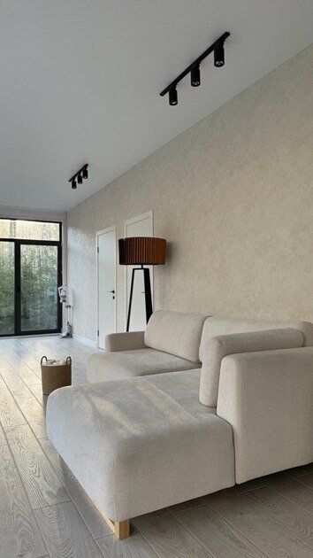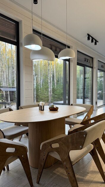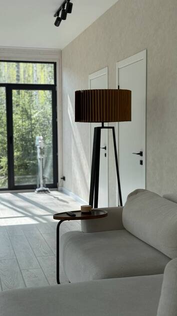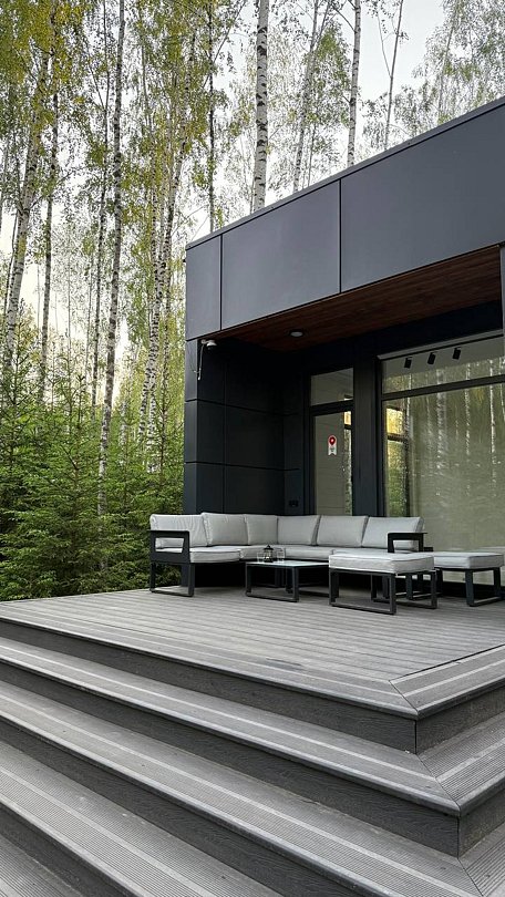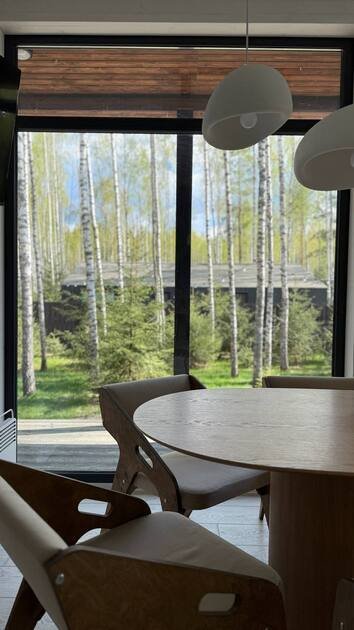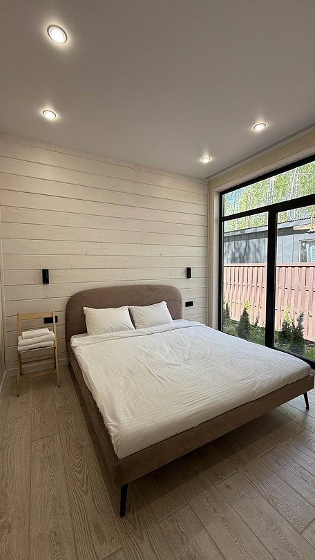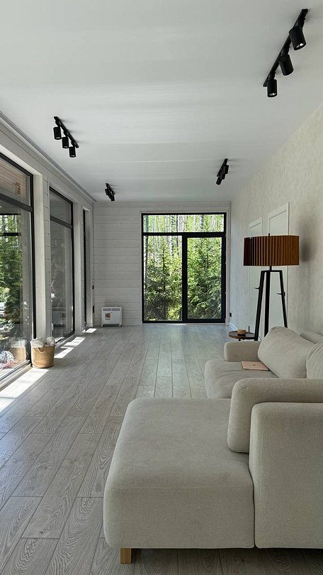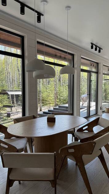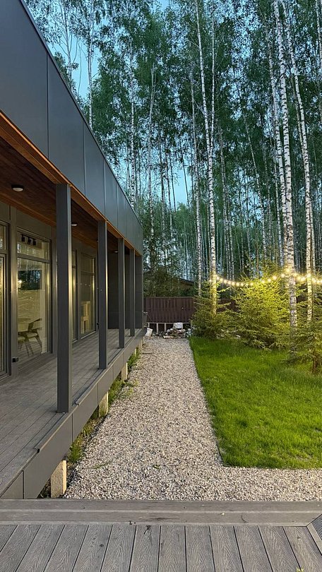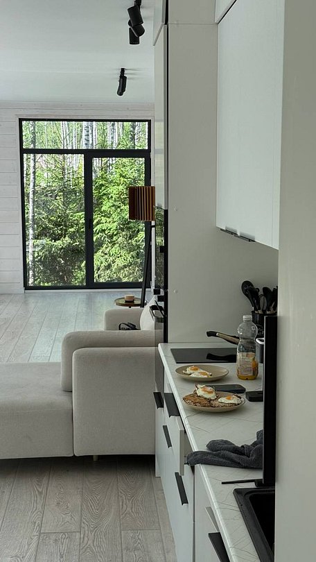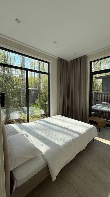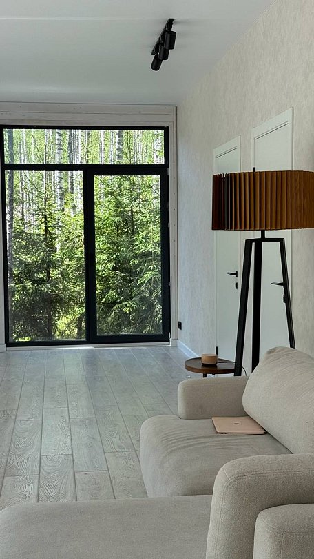 Просторный и современный дом, расположенный на лесном участке площадью девять соток, предлагает уют и стиль. В доме есть панорамная сауна и горячий чан.