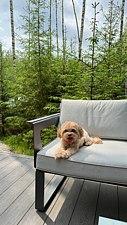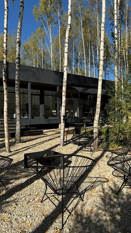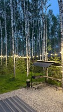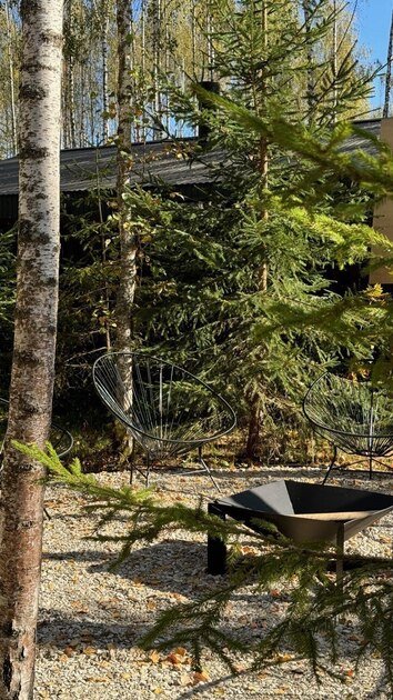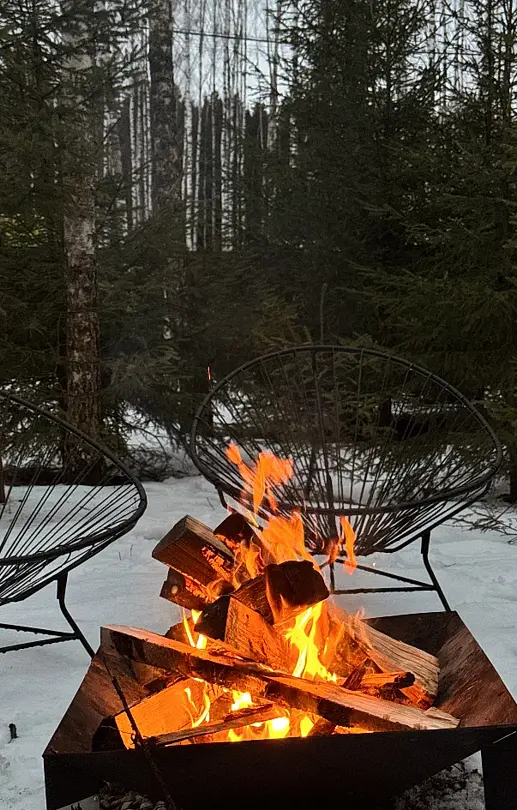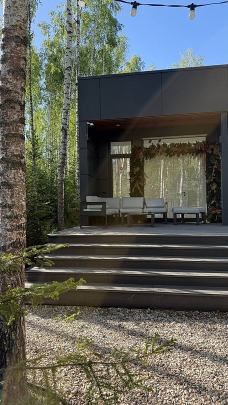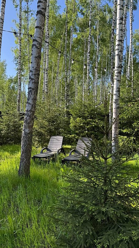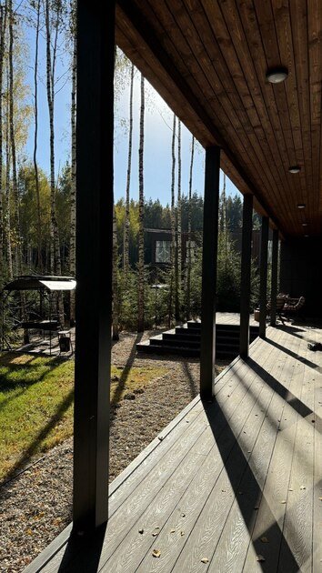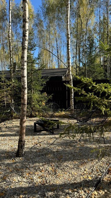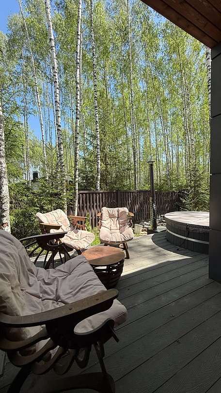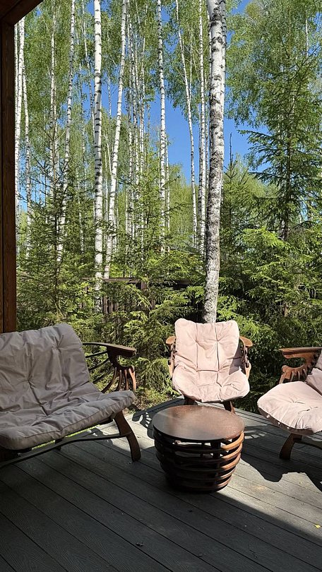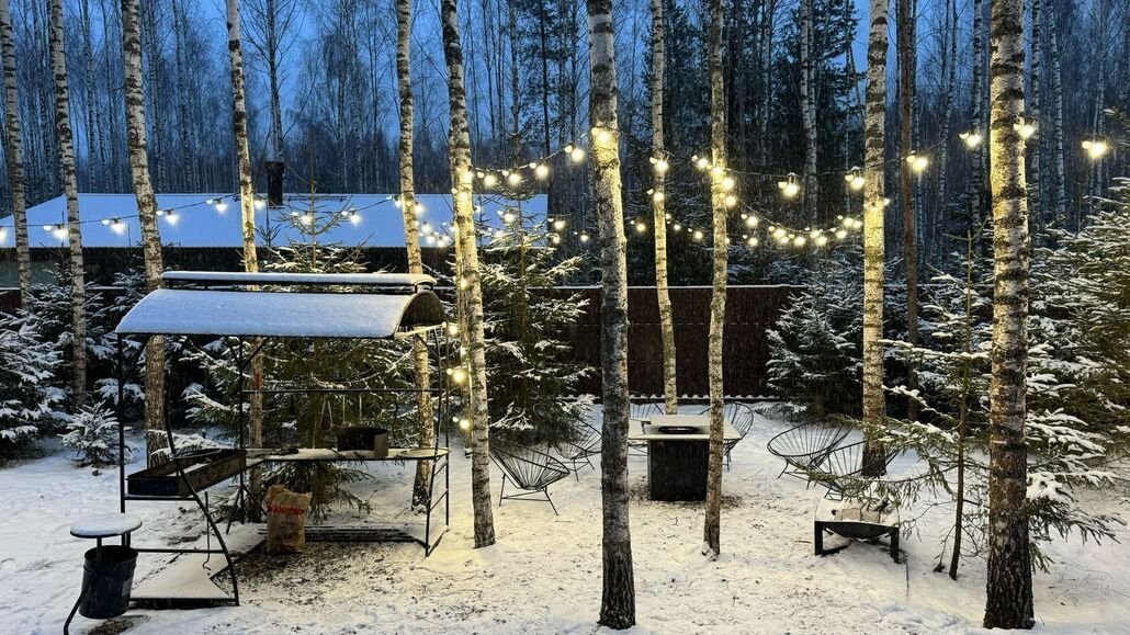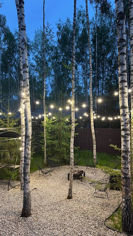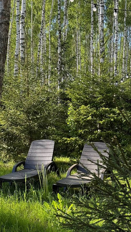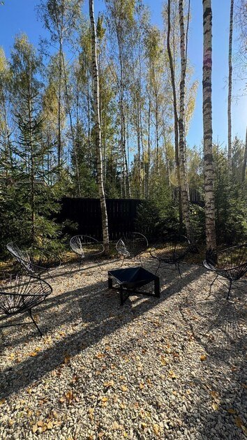 На участке площадью девять соток есть множество возможностей для активного и спокойного отдыха. Гости могут позавтракать на большой террасе, приготовить блюда на мангале или посидеть у костра под звездным небом вечером. Мягкий уголок с креслами обеспечит отдых после насыщенного дня. В доме есть сауна и чан, где можно расслабиться и восстановить силы.