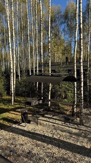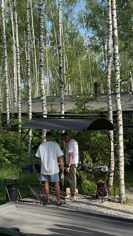 Возле дома находится оборудованная мангальная зона с персональным навесом, где гости могут готовить разнообразные блюда на открытом огне, наслаждаясь свежим воздухом и приятной компанией друзей и близких в любое время года и в любых погодных условиях. Важно отметить, что уголь и розжиг нужно привезти с собой.