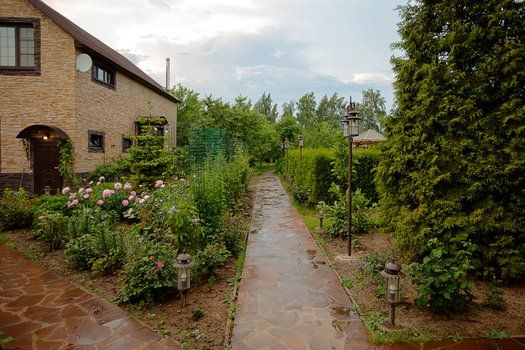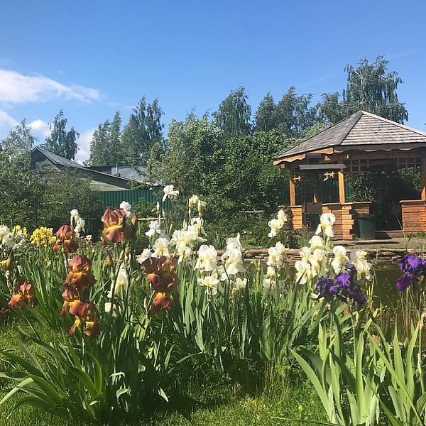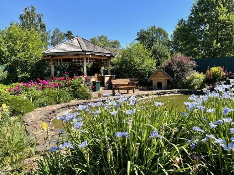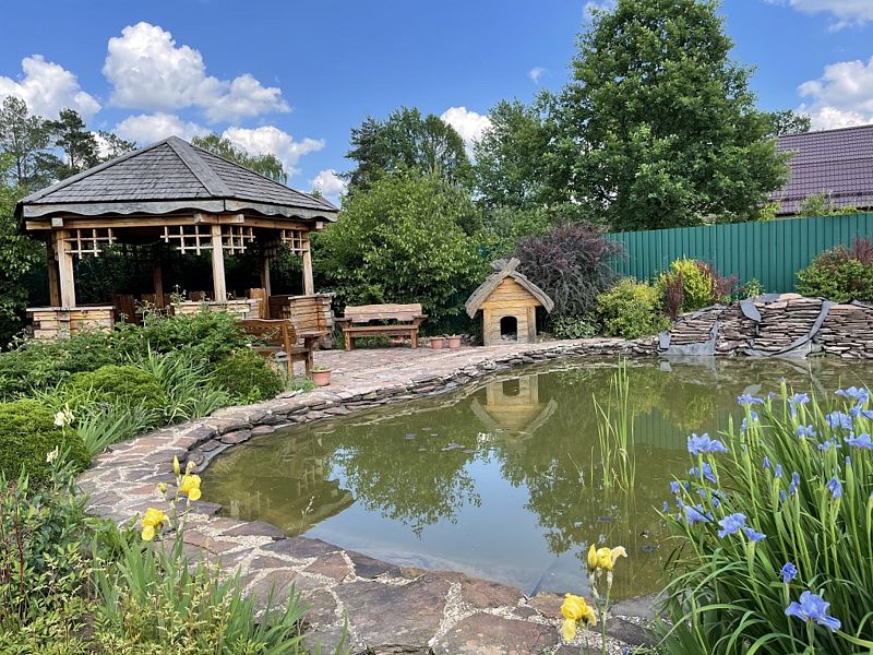 На участке в 25 соток расположен плодовый сад, множество цветников и газонов, красивый ландшафтный дизайн.