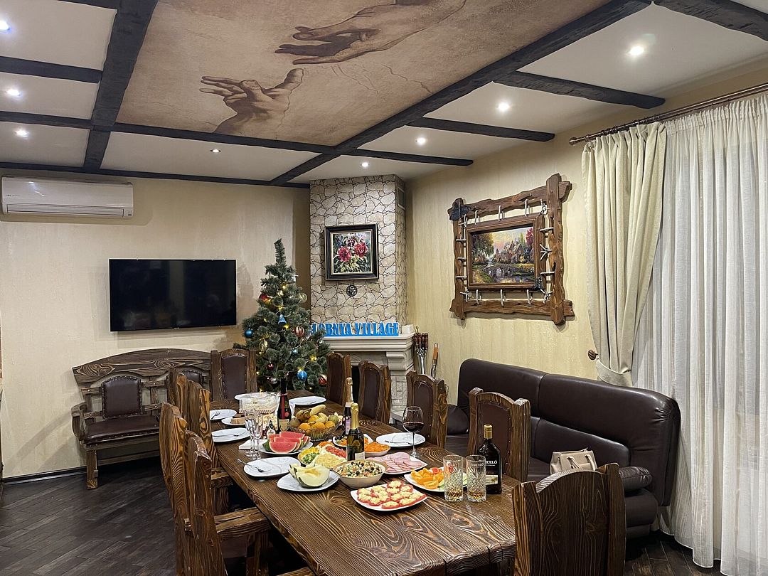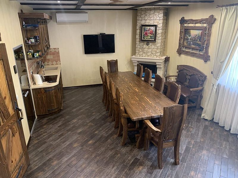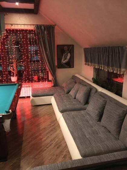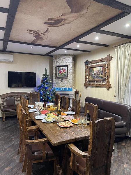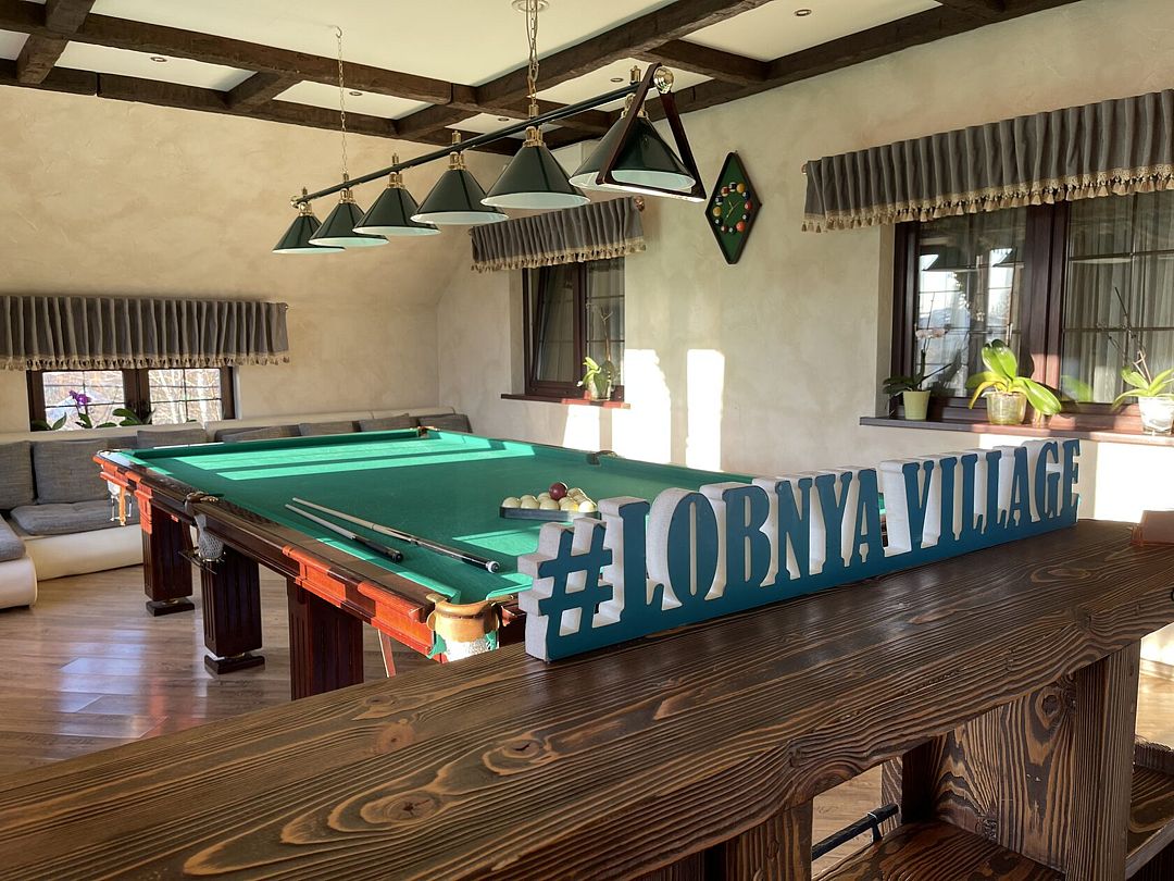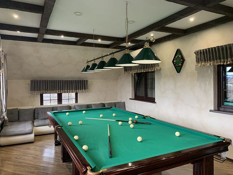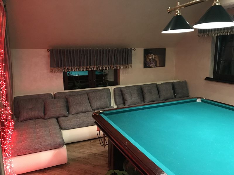 - 2 дивана(сдвинуты) с полноценными спальными местами(есть на фото) и матрас, профессиональный Русский бильярд 12 футов. Барная стойка и стулья , винный шкаф.