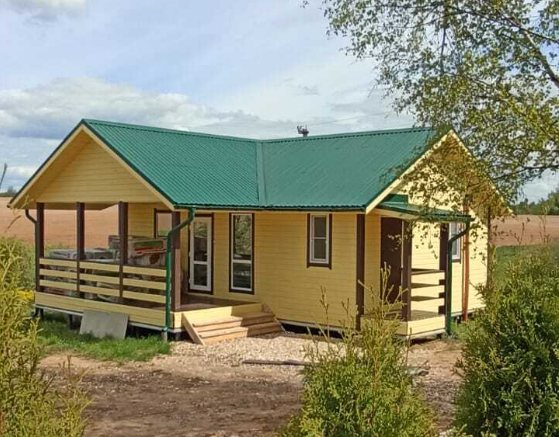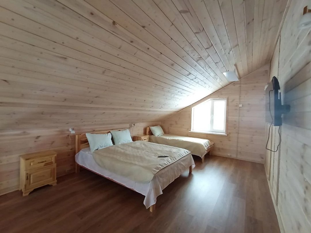 В каждом доме одна двуспальная кровать и одна односпальная.