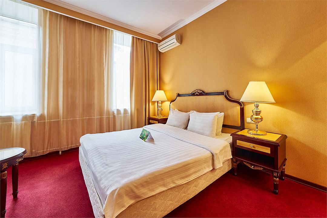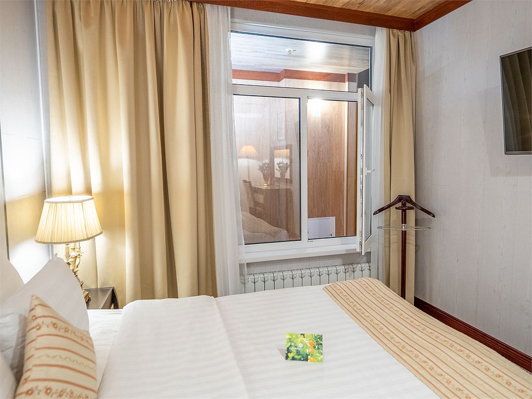 Уютный двухместный номер категории «Стандарт» — прекрасный вариант для недорогого, но комфортного размещения двух гостей. В таком номере все располагает к комфортному отдыху: уютный интерьер, комфортная кровать — одна двуспальная (160х200 см либо 180х200 см) или две раздельные (90х200 см либо 120х200 см) с ортопедическим матрасом.