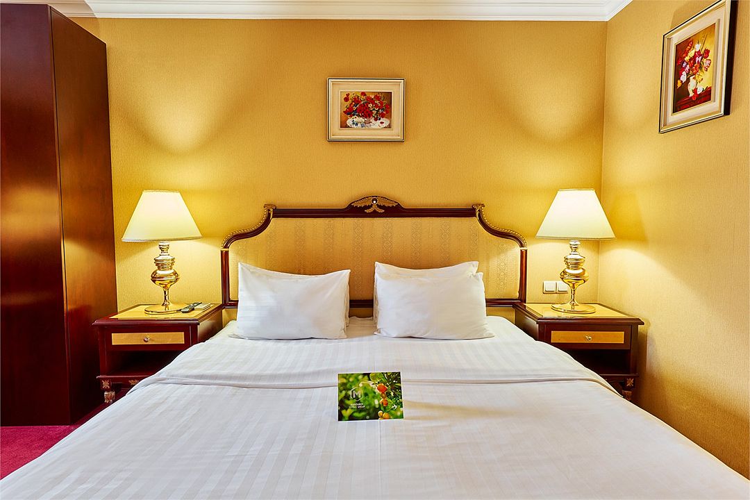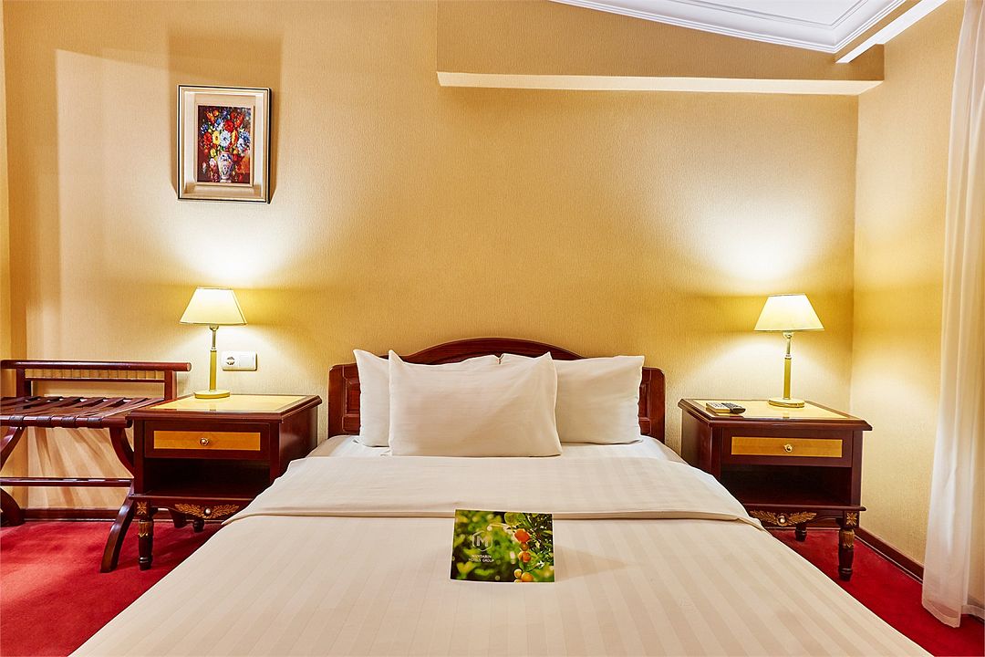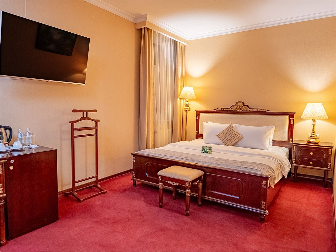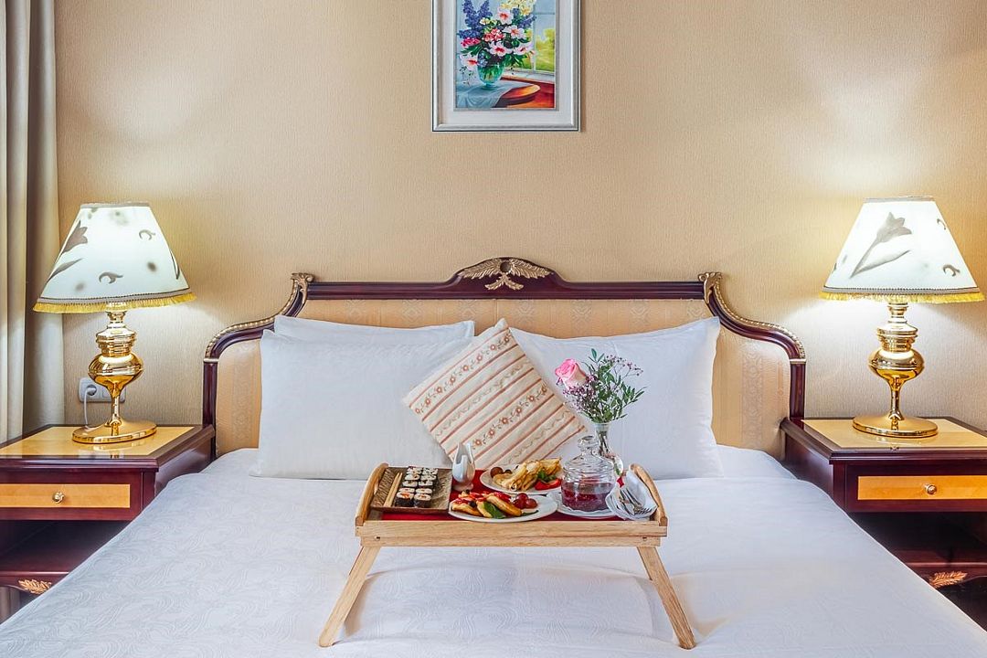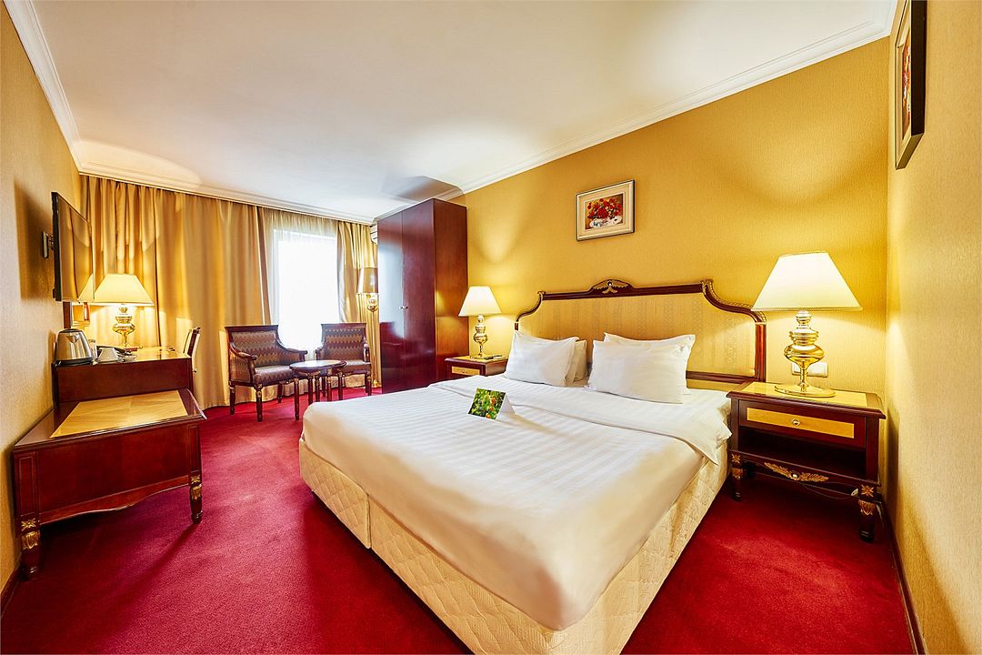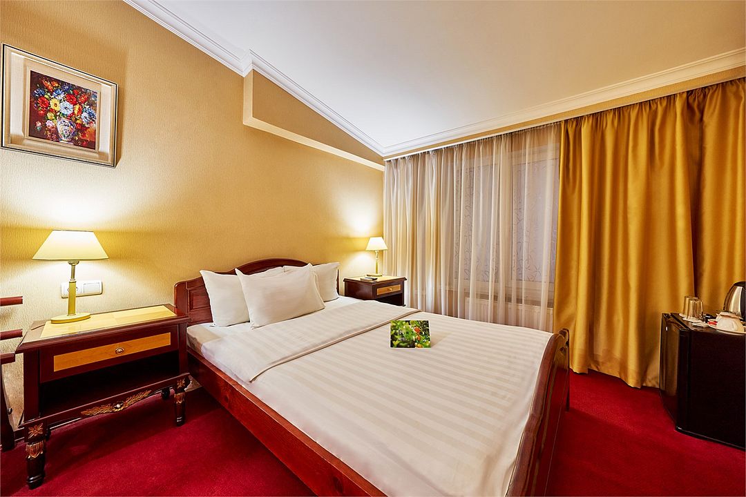 Шикарный номер категории «Делюкс» – оптимальный выбор для солидного гостя, влюбленной пары, молодоженов. Просторный и комфортный, с тщательно продуманным интерьером — здесь есть все, что может понадобиться вам во время отдыха.