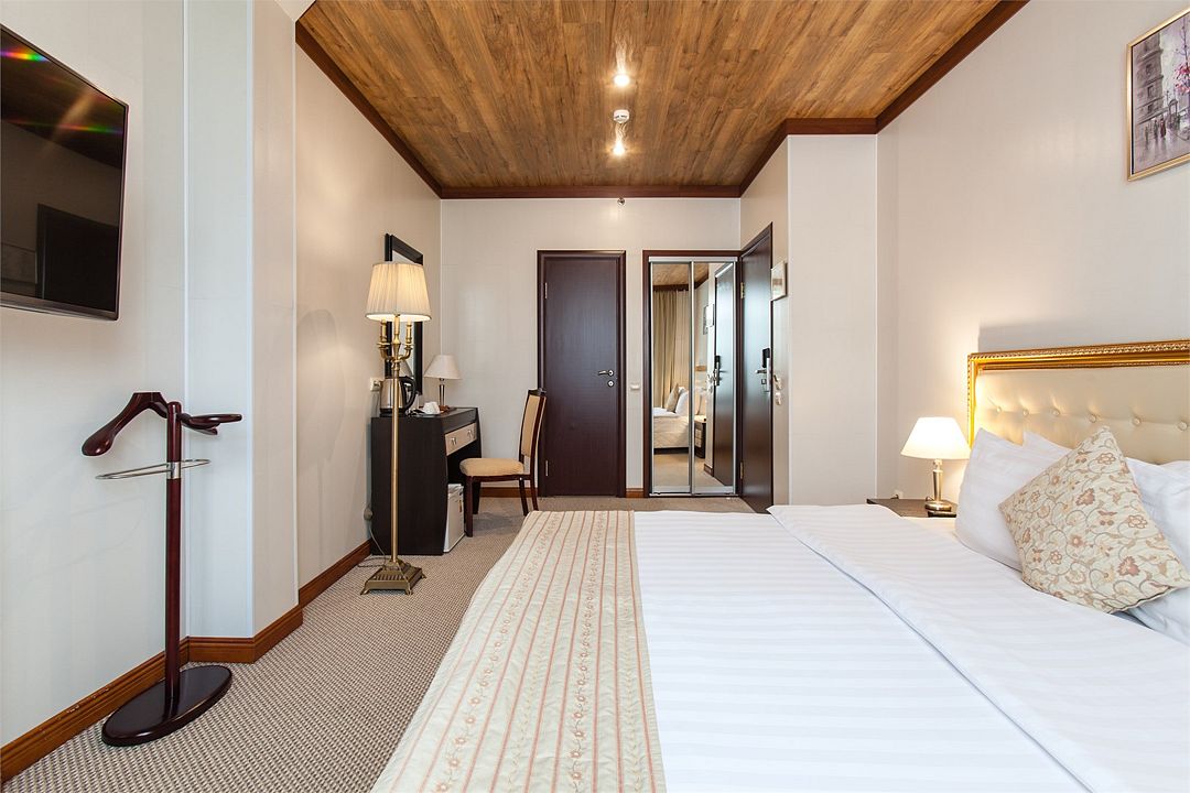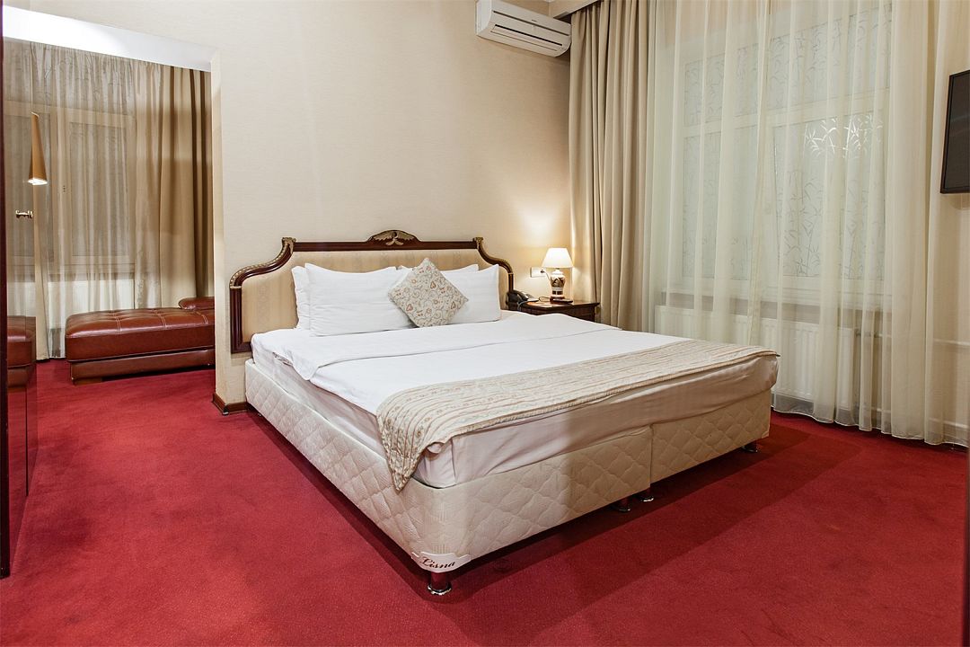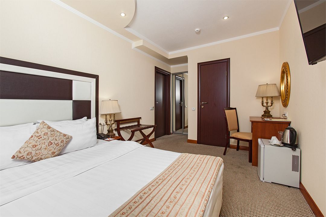 Номер категории «Бизнес» — оптимальный вариант как для рабочей поездки или встречи с деловыми партнерами, так и для романтического отдыха. Широкая кровать размера «King size» гарантирует вам прекрасный сон.