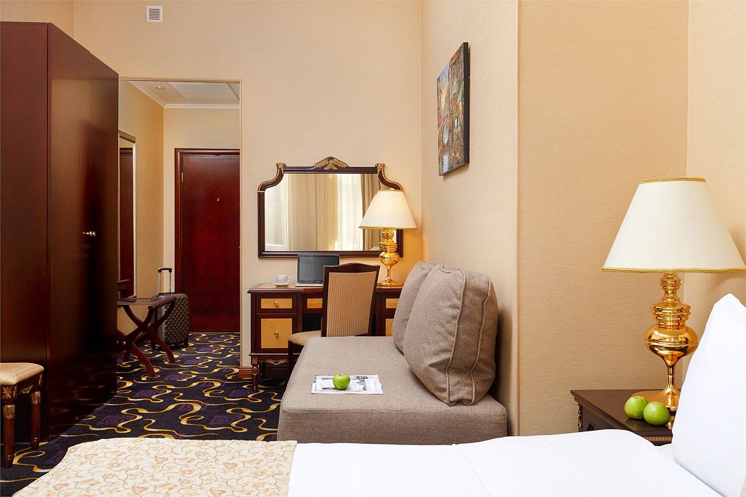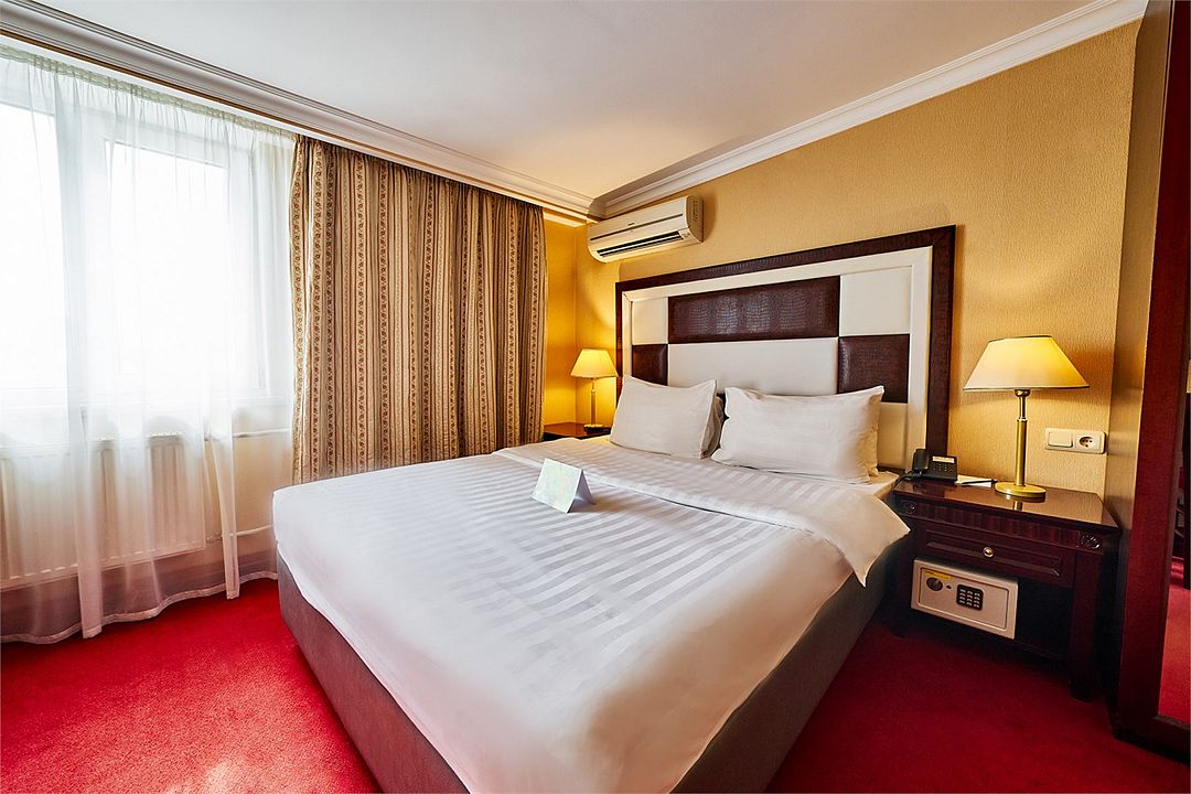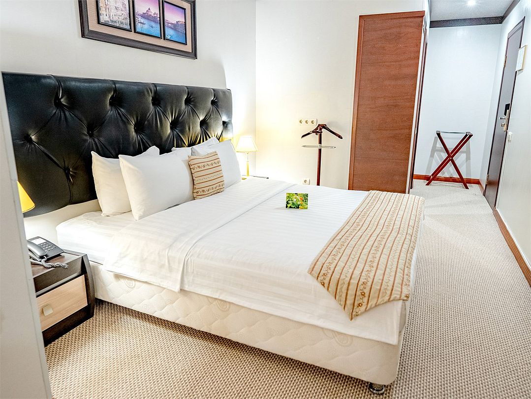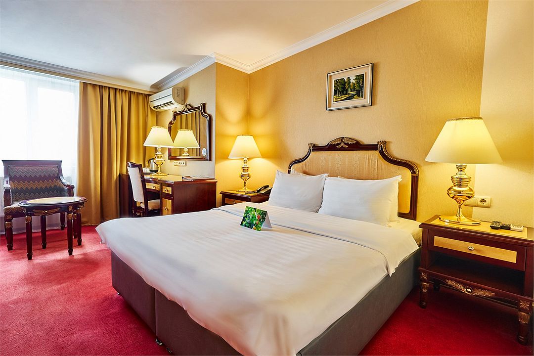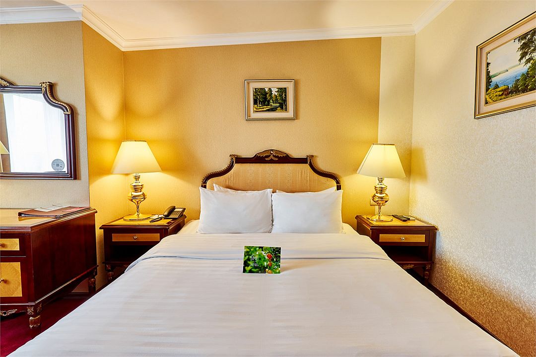 В номере широкая двуспальная кровать размера «King size», а также диван/диван-кушетка как место полноценного размещение третьего гостя. Ценные вещи и документы можно оставить в сейфе. Номера укомплектованы мини-баром, чайной станцией, телефоном, феном, гладильными принадлежностями и халатами.