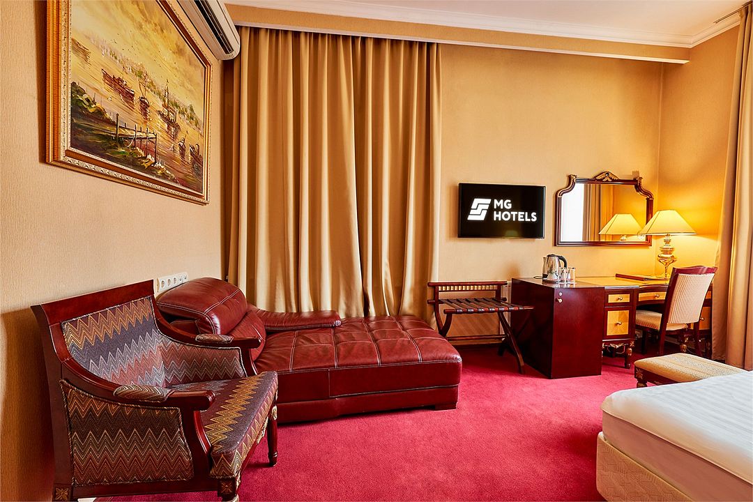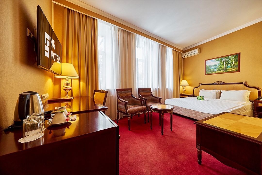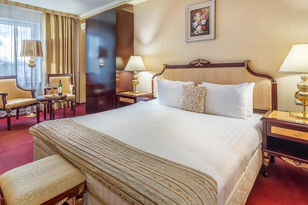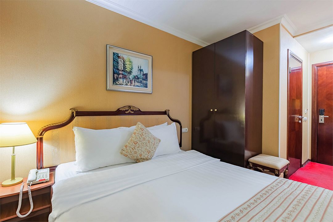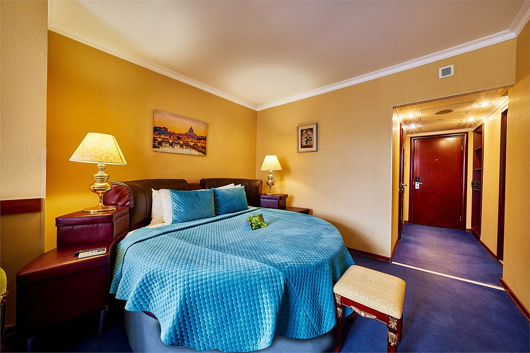 В номере широкая двуспальная кровать размера «King size», а также диван/диван-кушетка как место полноценного размещение третьего гостя. Ценные вещи и документы можно оставить в сейфе. Номера укомплектованы мини-баром, чайной станцией, телефоном, феном, гладильными принадлежностями и халатами.