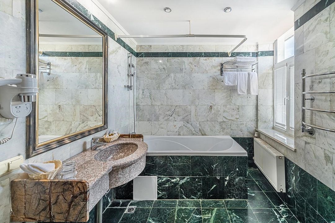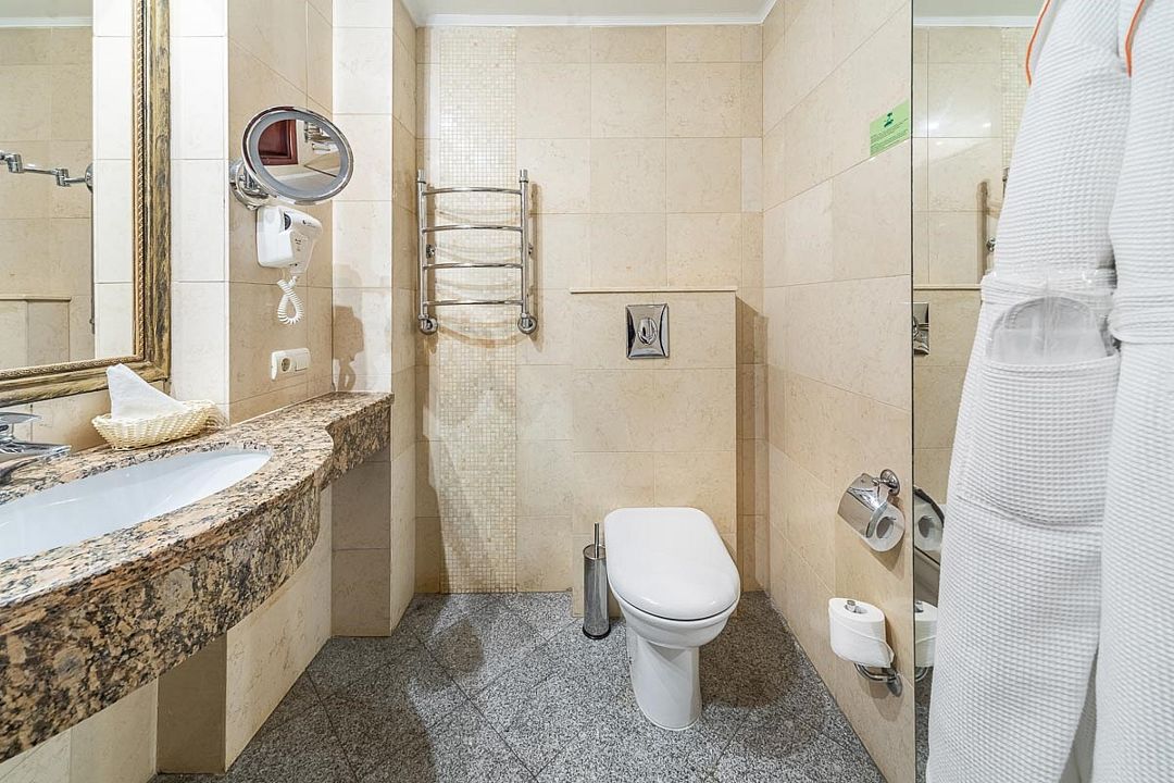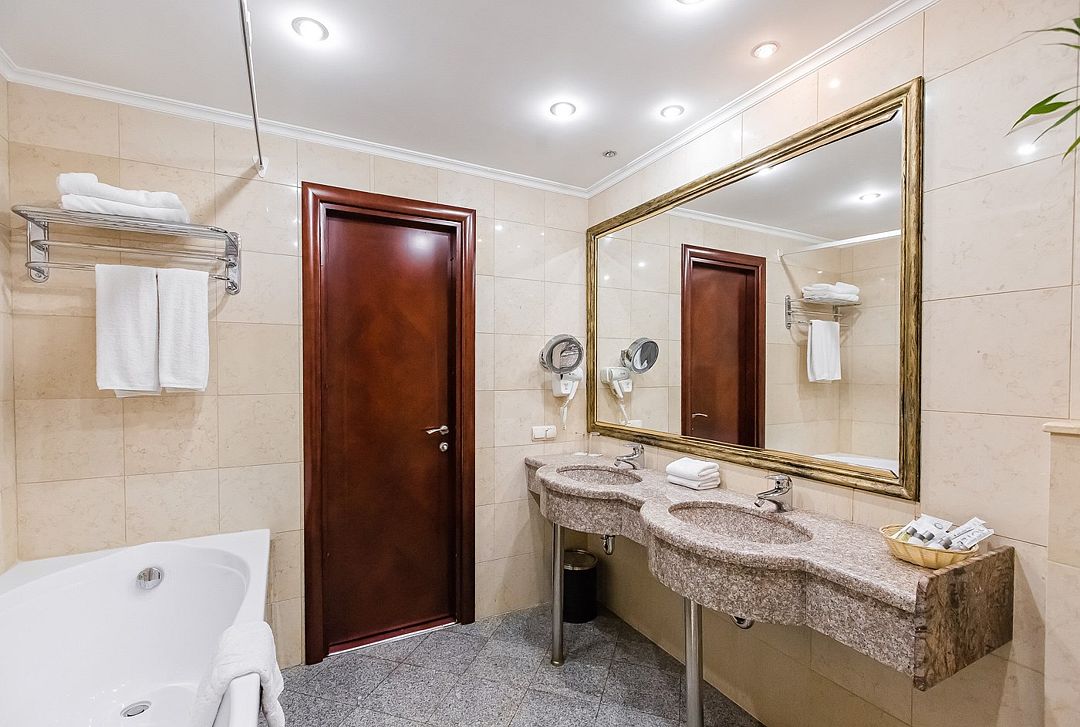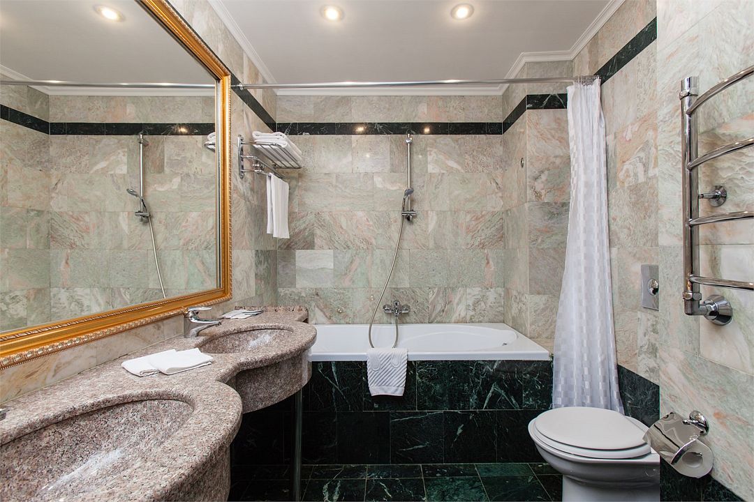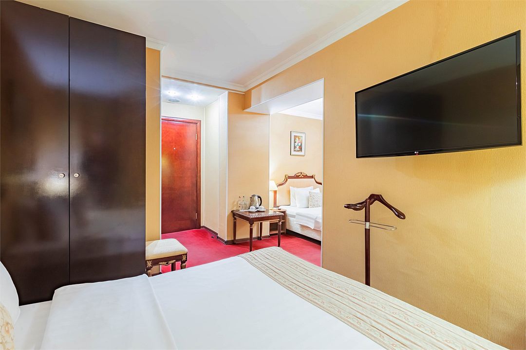 Также каждая из комнат номера укомплектована мини-баром, чайной станцией, телефоном, феном, гладильными принадлежностями и халатами. В каждой комнате имеется свой собственный сан узел с ванной. Окна номера выходят во внутренний двор, так что можете быть уверены: вашему отдыху не помешает шум.