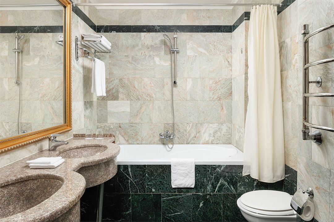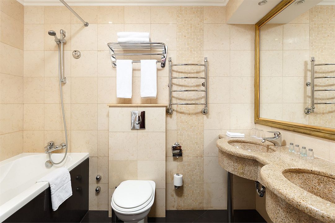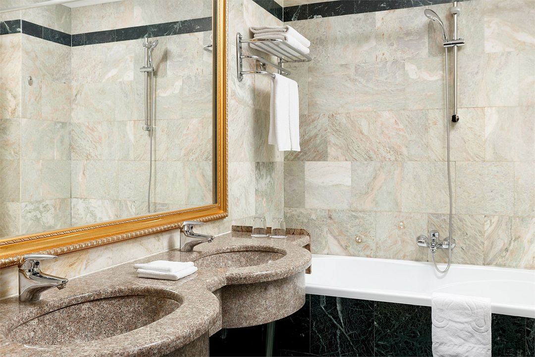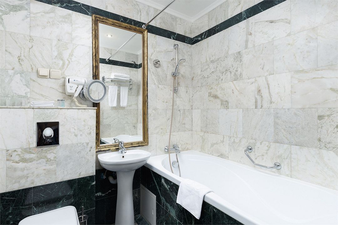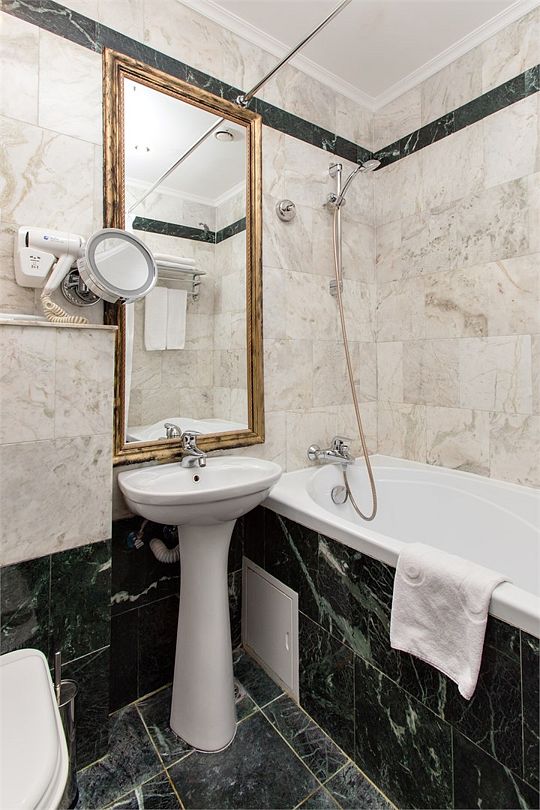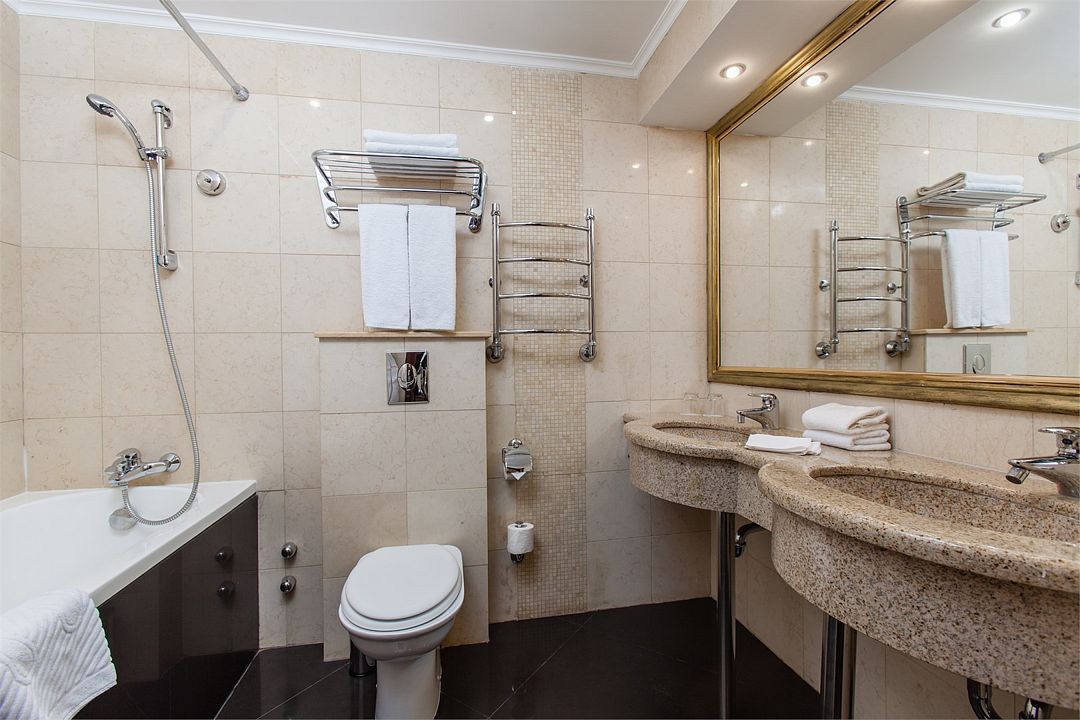 Также каждая из комнат номера укомплектована мини-баром, чайной станцией, телефоном, феном, гладильными принадлежностями и халатами. В каждой комнате имеется свой собственный сан узел с ванной. Окна номера выходят во внутренний двор, так что можете быть уверены: вашему отдыху не помешает шум.