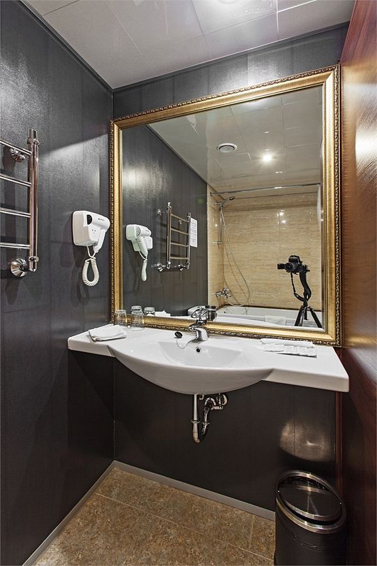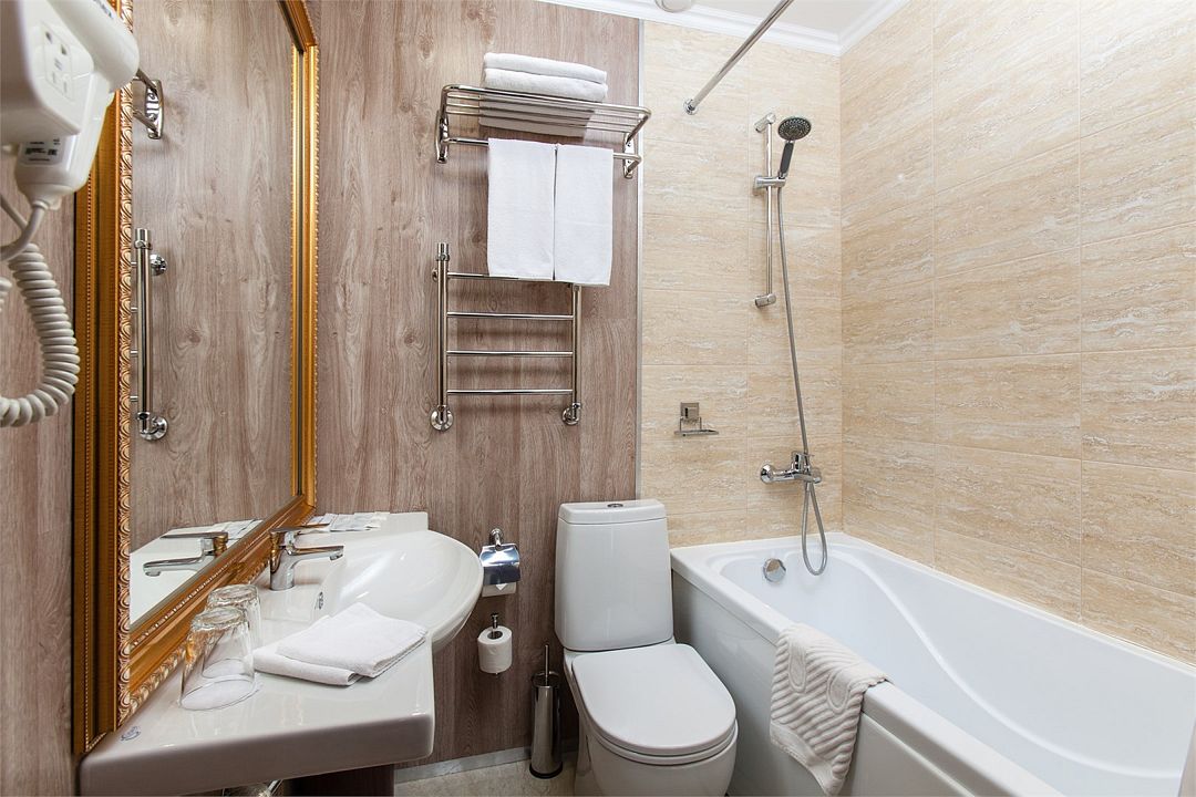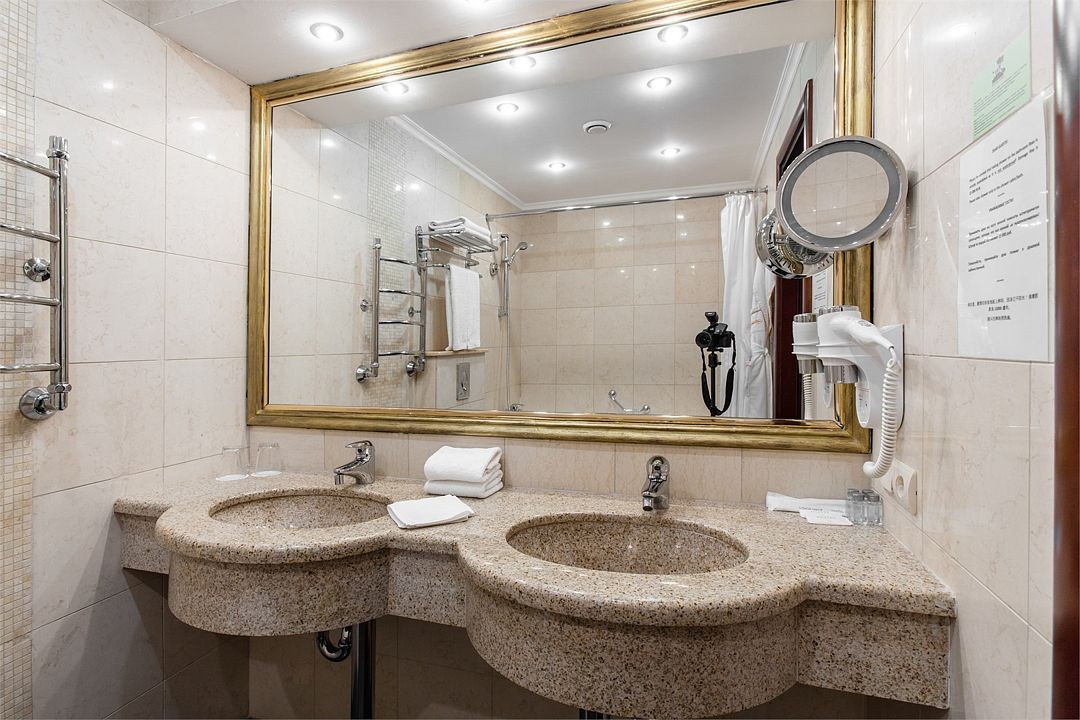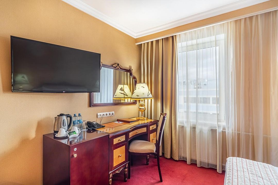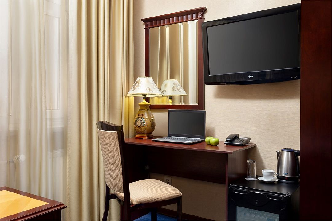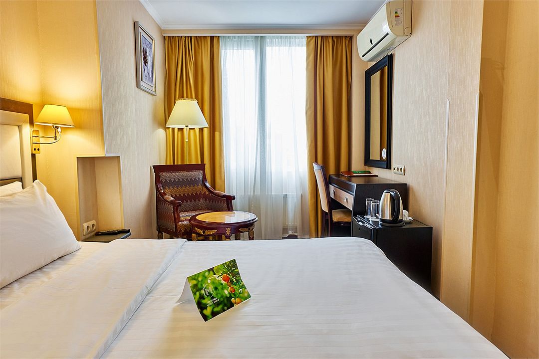 Также номера укомплектованы мини-баром, чайной станцией, телефоном, феном, гладильными принадлежностями. Окна номеров категории «Стандарт» выходят в уютный атриум отеля либо в коридор.