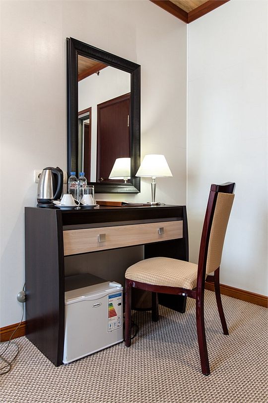 В номерах выделена гостиная зона с креслами и кофейным столиком. Если вам понадобится поработать — можно воспользоваться рабочей зоной с удобным письменным столом. Уходя на прогулку, вы можете оставить документы и ценности в мини-сейфе.