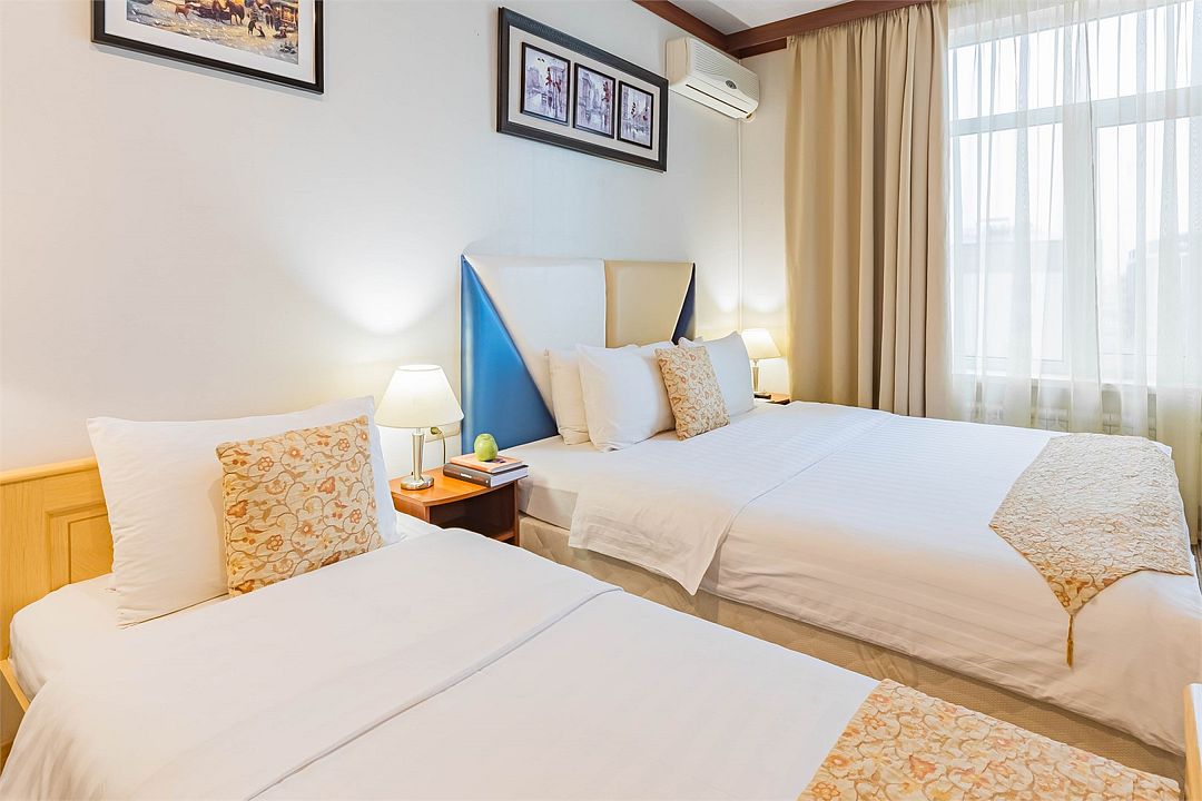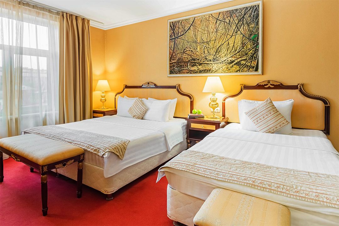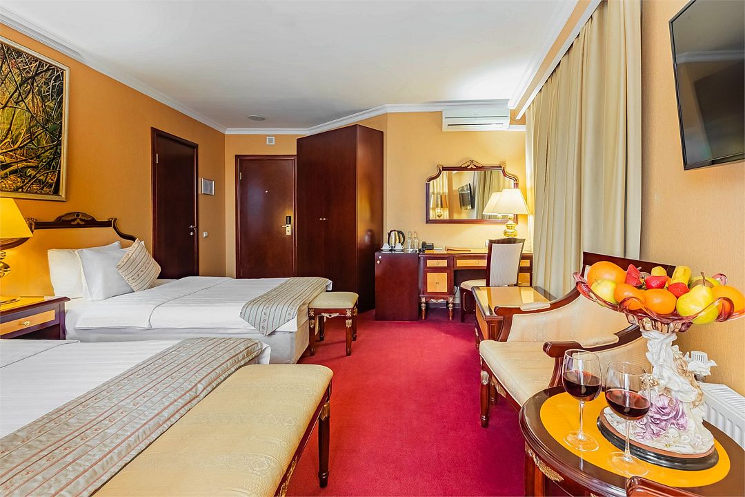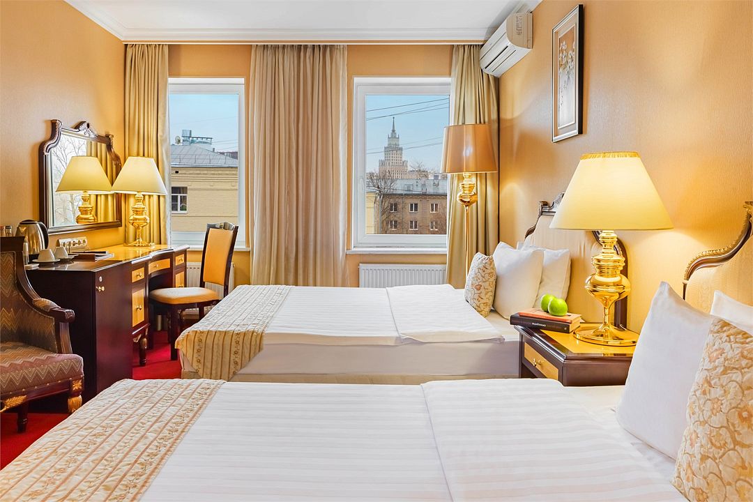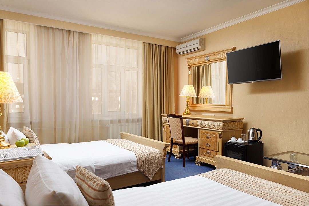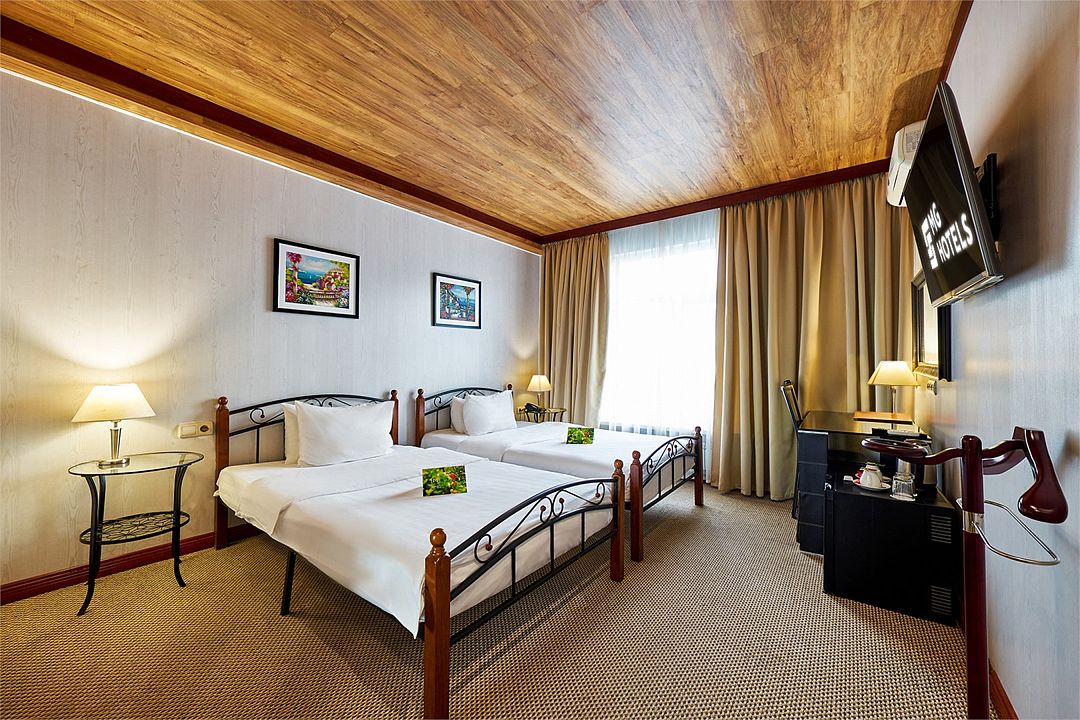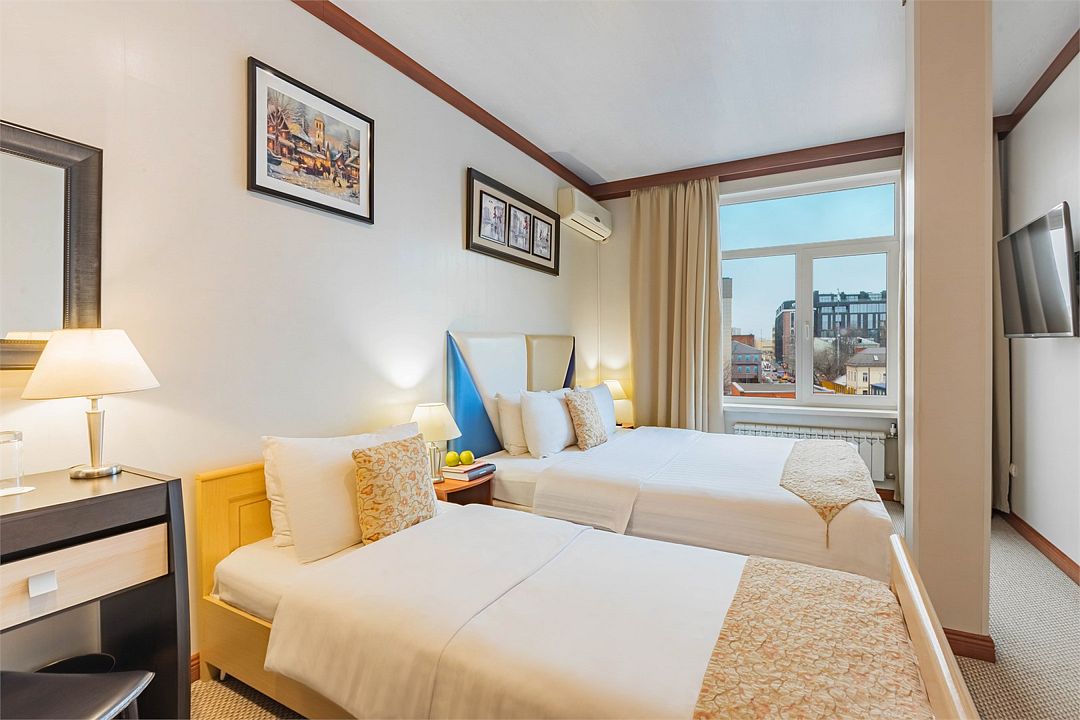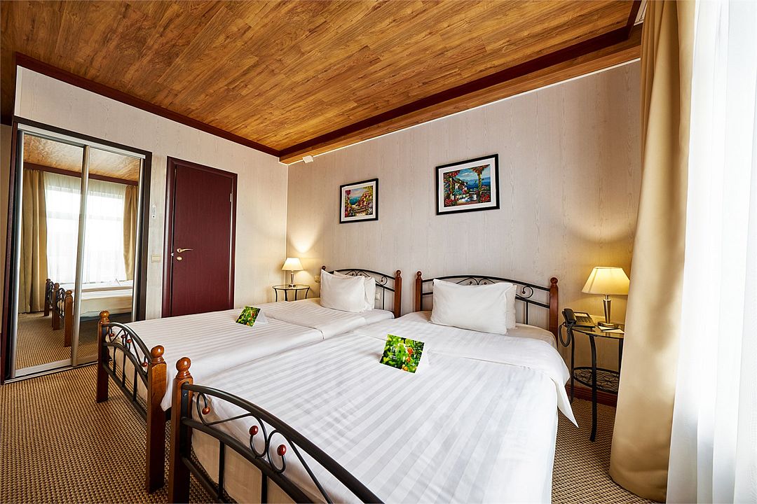 Комфортный номер категории «улучшенный» с двумя отдельно стоящими кроватями — отличный вариант для размещения двух гостей, прибывших с деловой поездкой, или друзей, путешествующих вдвоем.