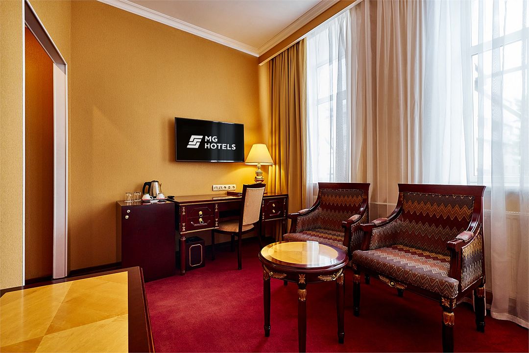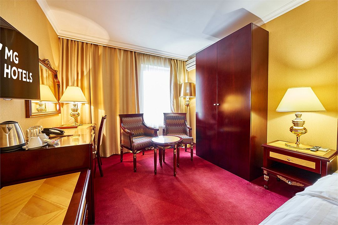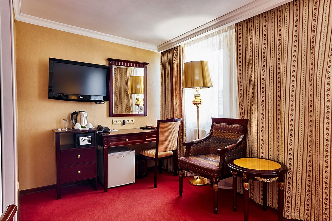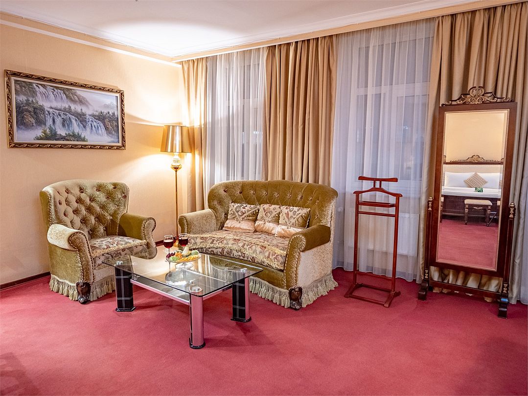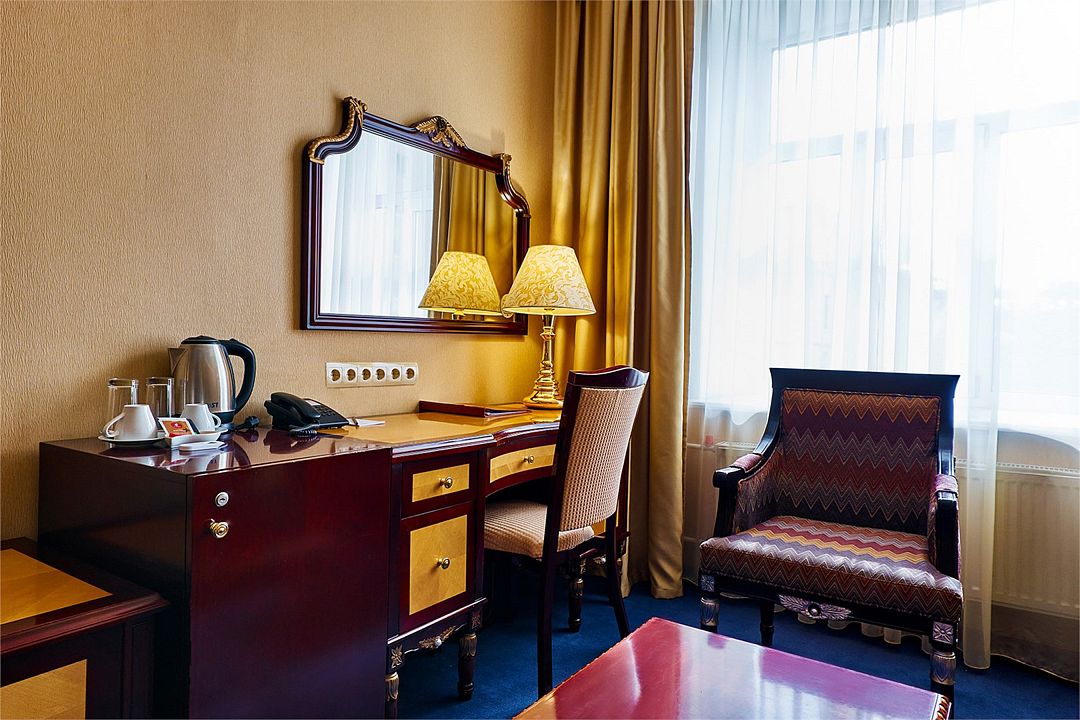 Отдельно выделена гостиная зона с креслами и кофейным столиком. Номера укомплектованы мини-баром, чайной станцией, телефоном, феном, гладильными принадлежностями и халатами. Окна номера выходят на тихую улицу, внутренний двор и на город, так что можете быть уверены: вашему отдыху не помешает шум.