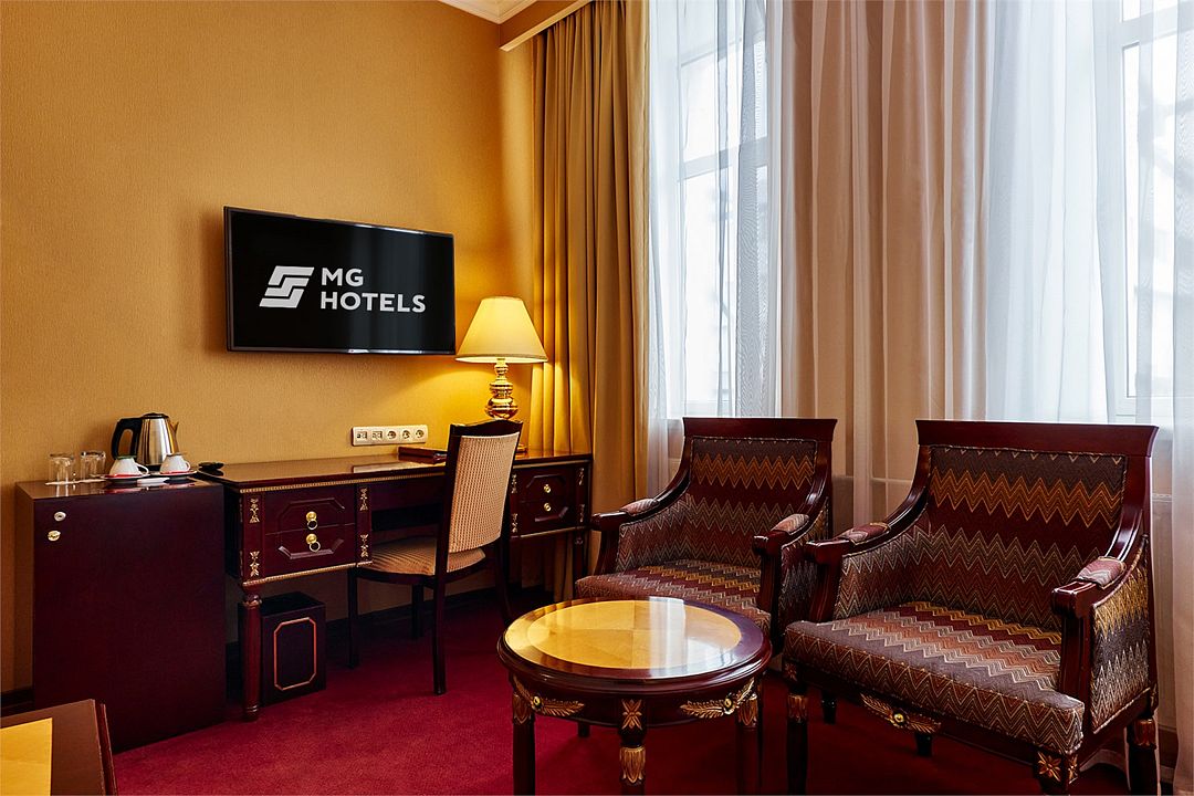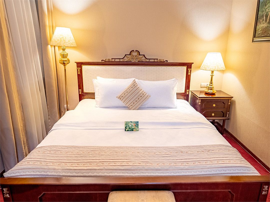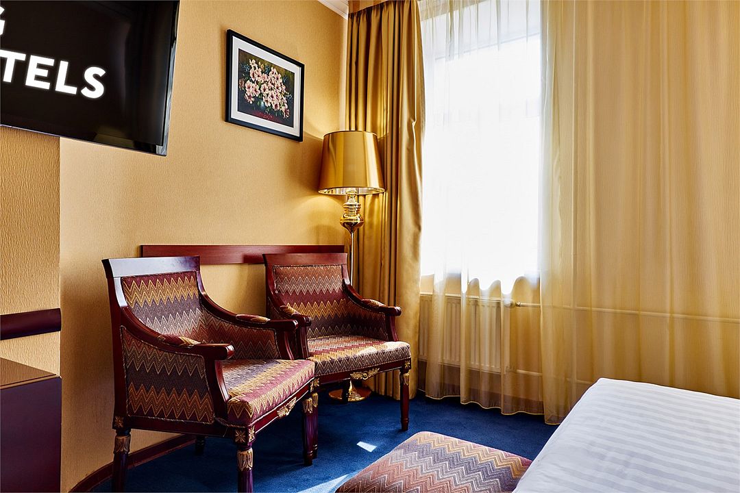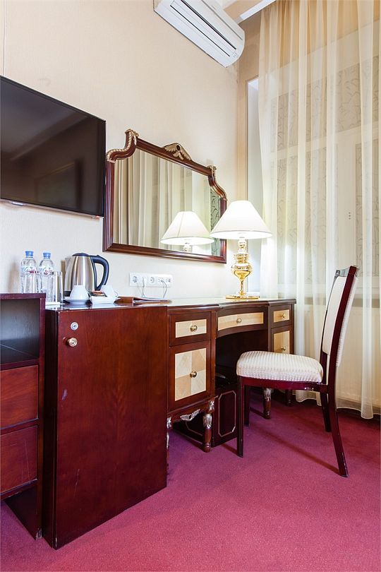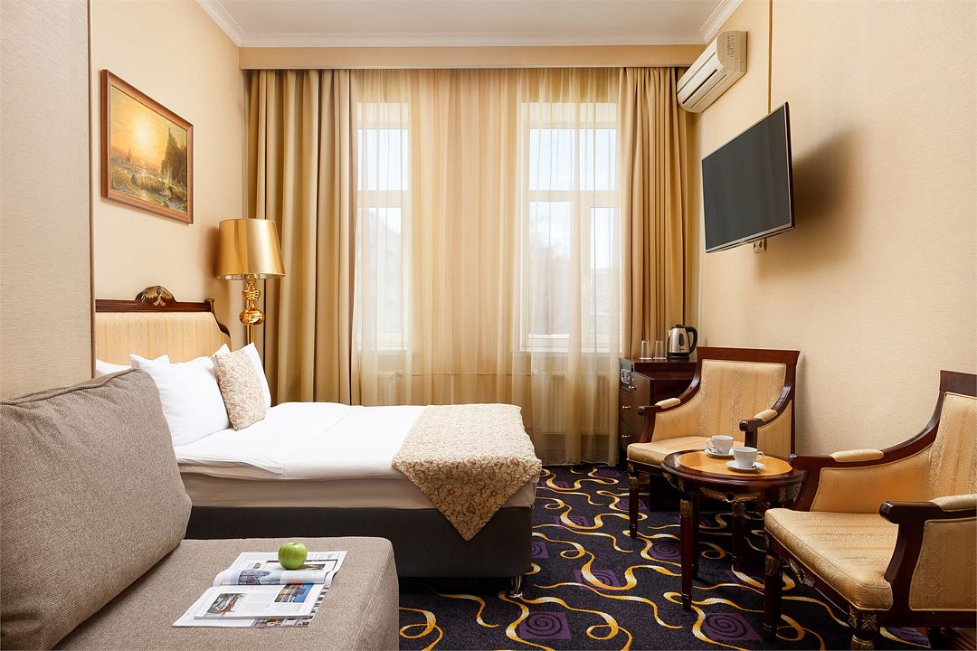 Отдельно выделена гостиная зона с креслами и кофейным столиком. Номера укомплектованы мини-баром, чайной станцией, телефоном, феном, гладильными принадлежностями и халатами. Окна номера выходят на тихую улицу, внутренний двор и на город, так что можете быть уверены: вашему отдыху не помешает шум.